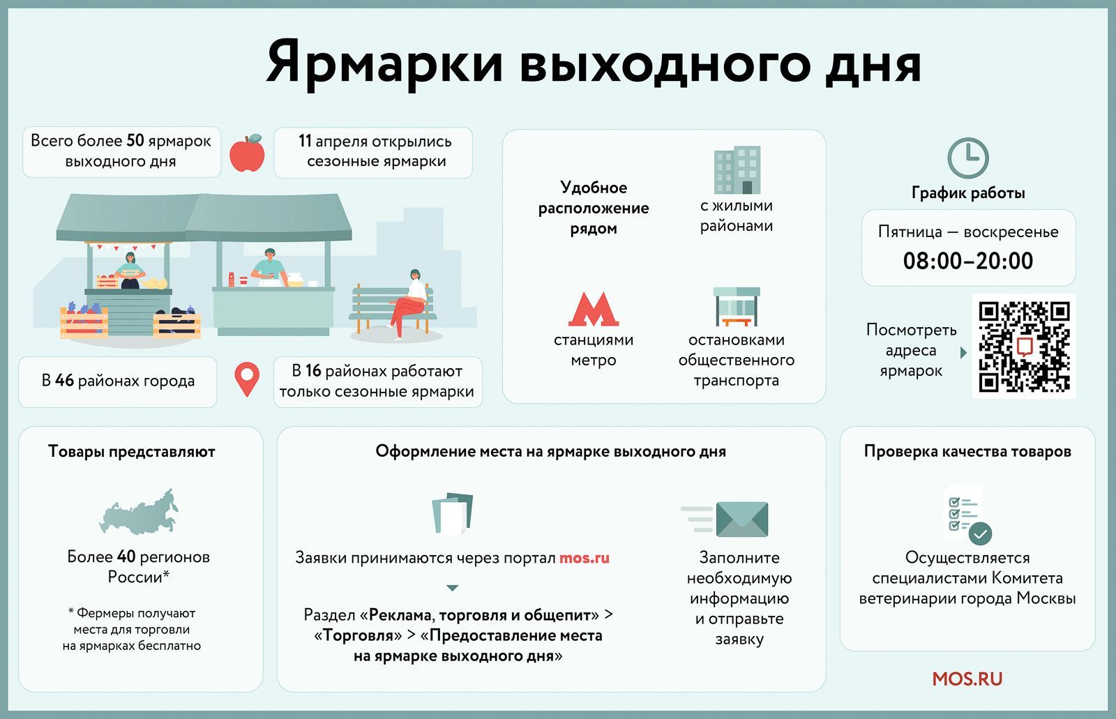 Ярмарки выходного дня раскинулись по всей Москве, располагаясь вблизи станций метро и других оживленных местах. Участие для участников бесплатное.