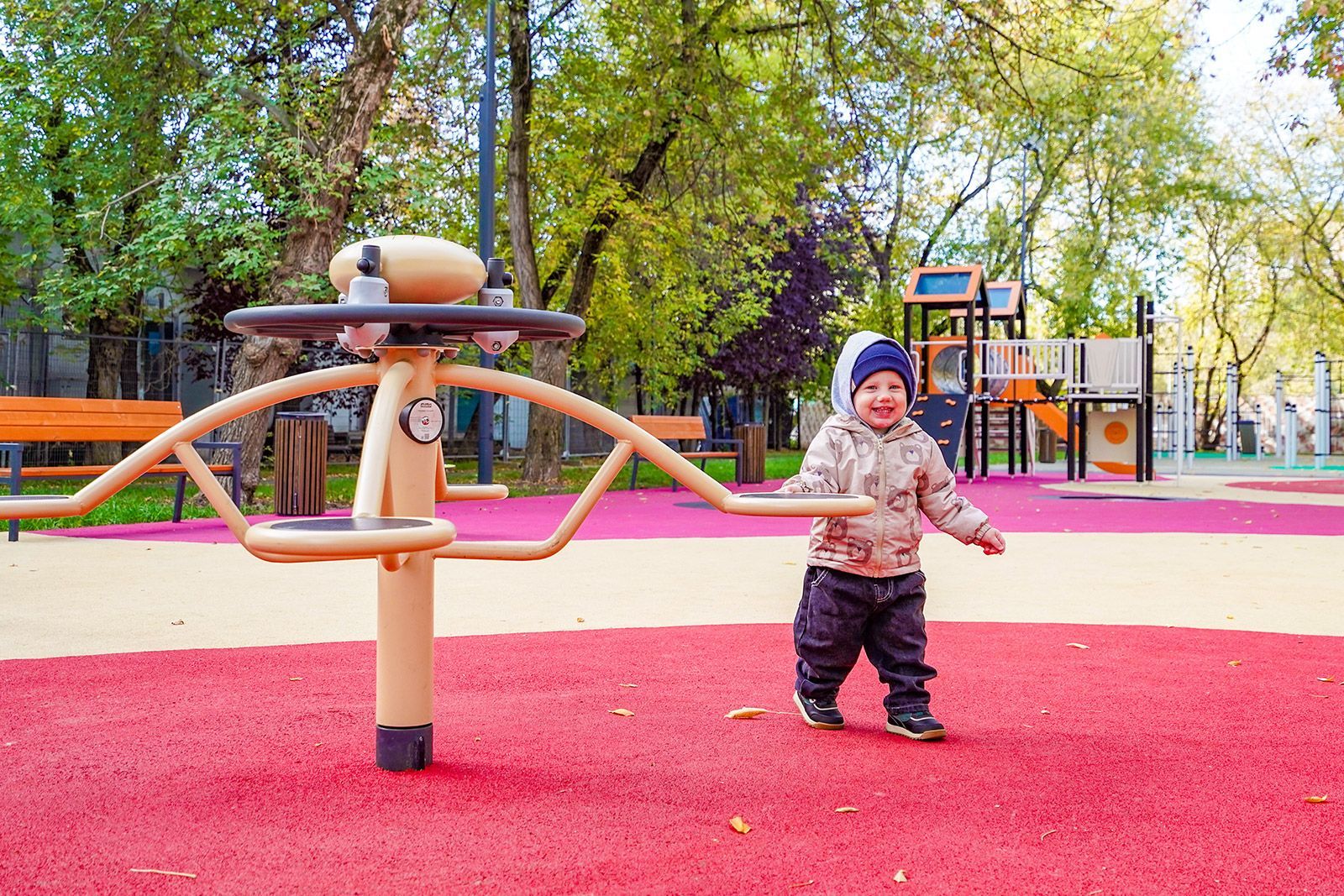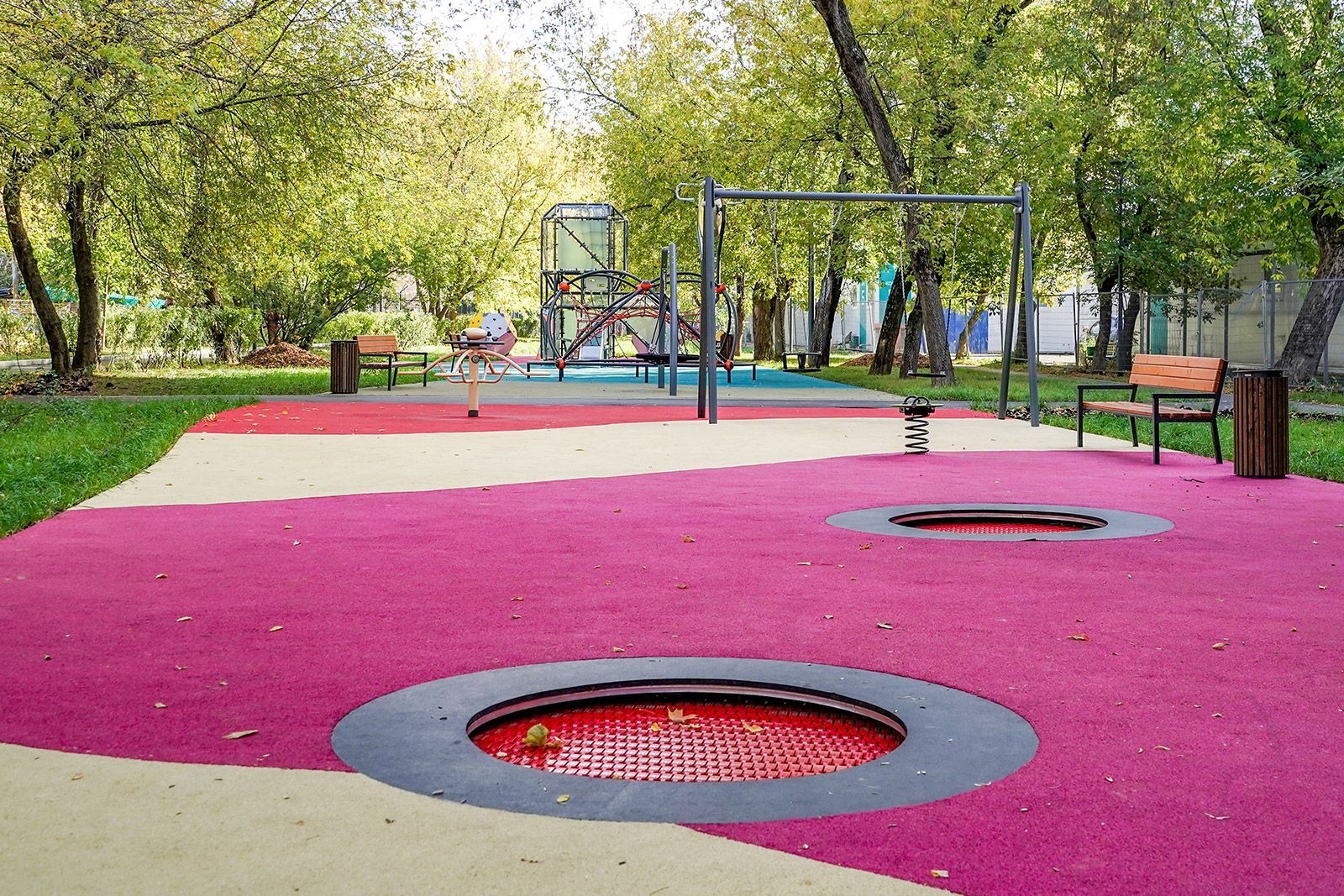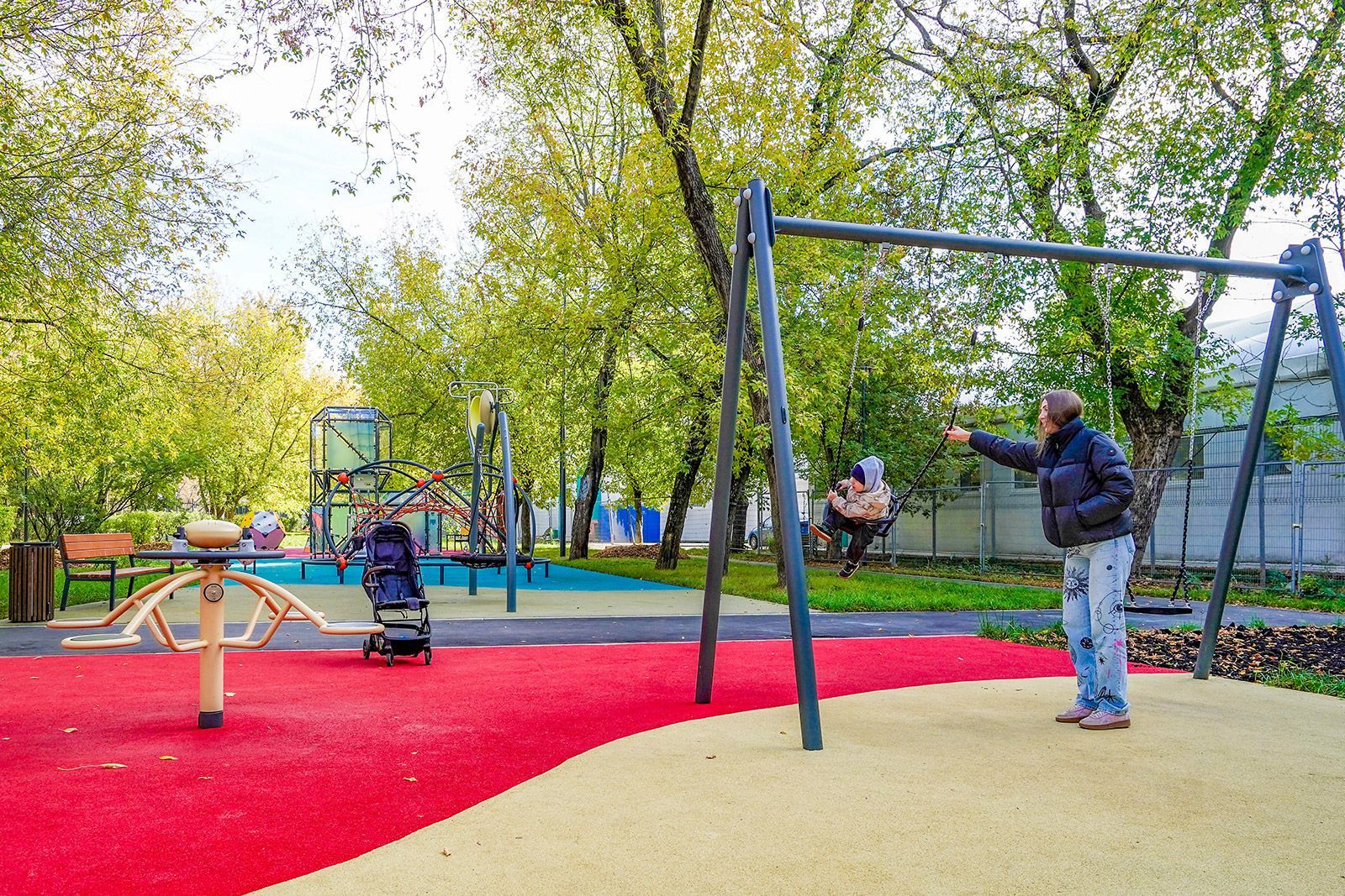 На месте старой детской площадки обустроили современную игровую зону. Здесь находятся оригинальные городки с различными горками, переходами и лазилками, которые помогут развивать координацию и ловкость детей. Установлены качели-гнезда и балансиры, а также появились батуты. Чтобы сделать игры более безопасными, вся игровая площадка покрыта резиновым покрытием. Для маленьких исследователей и творцов установили стилофон, а также модули "Слушай город" и "Плавучий маяк".