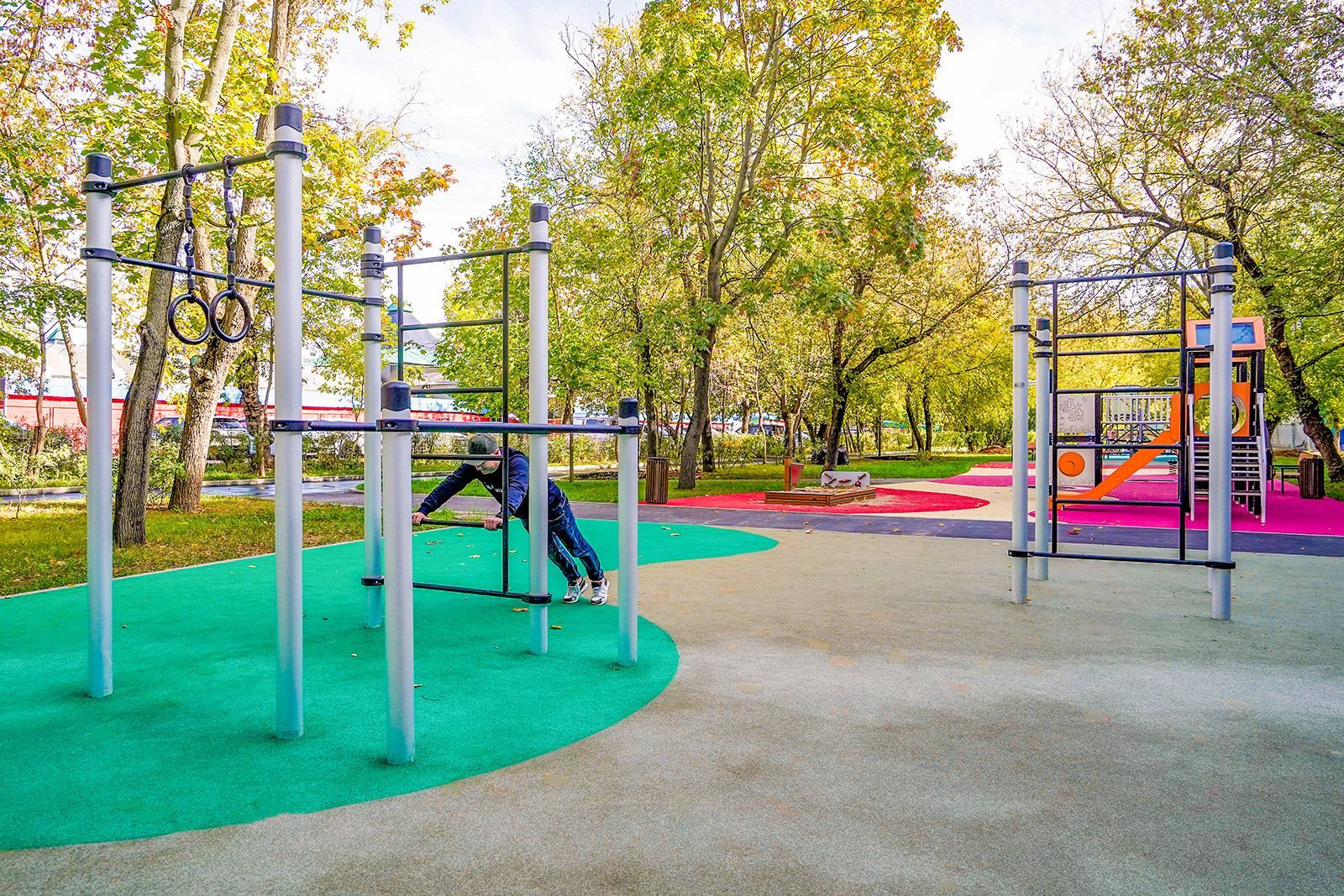 В спортивной зоне присутствуют комплексы для воркаута, оснащенные турниками и кольцами. Любители паркура также найдут здесь оборудование для тренировок.
