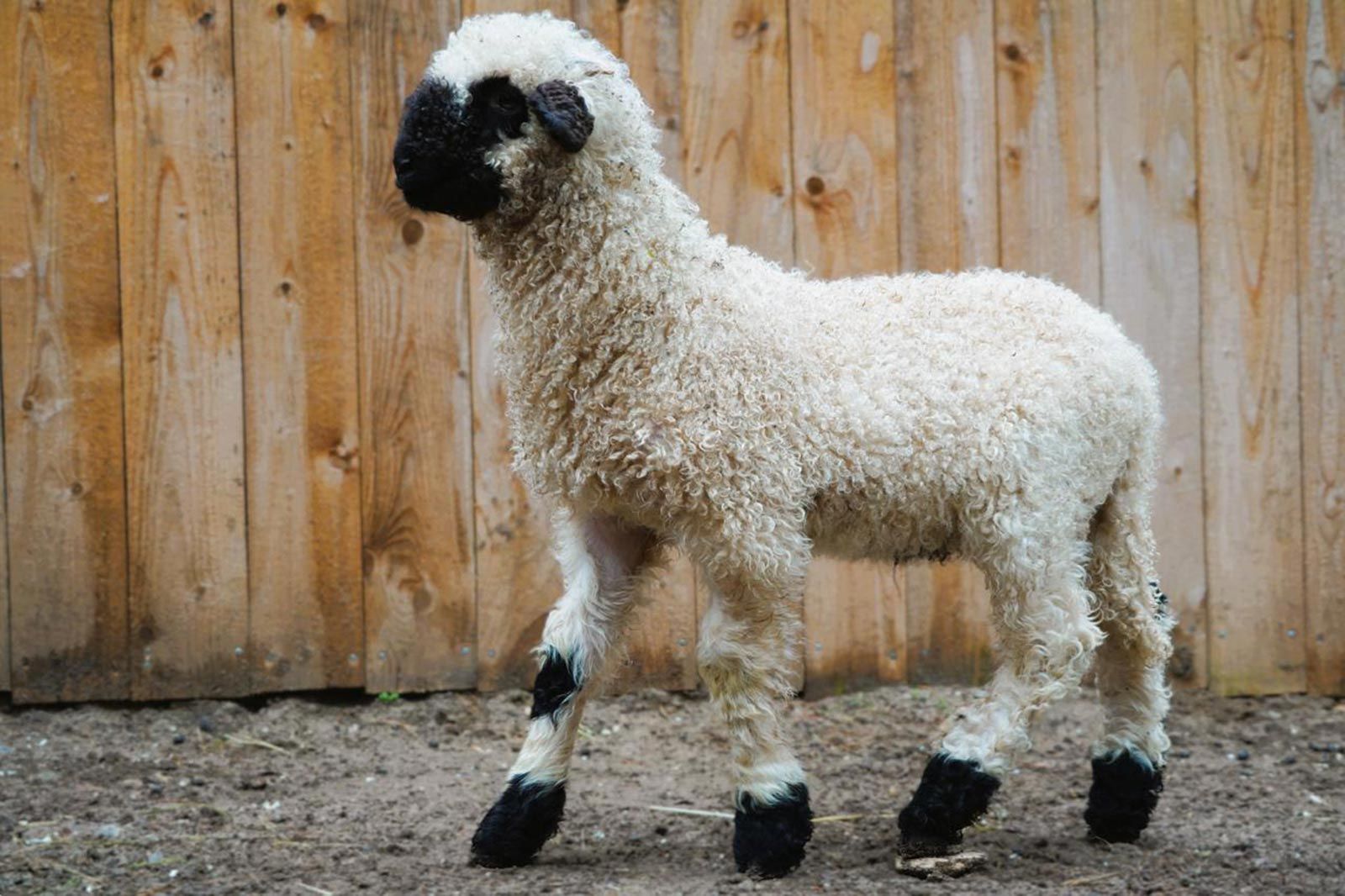 Ягненок принадлежит к валлийской породе овец, отличающейся своим контрастным окрасом: белоснежная шерсть туловища сочетается с черной мордочкой и темными ногами.