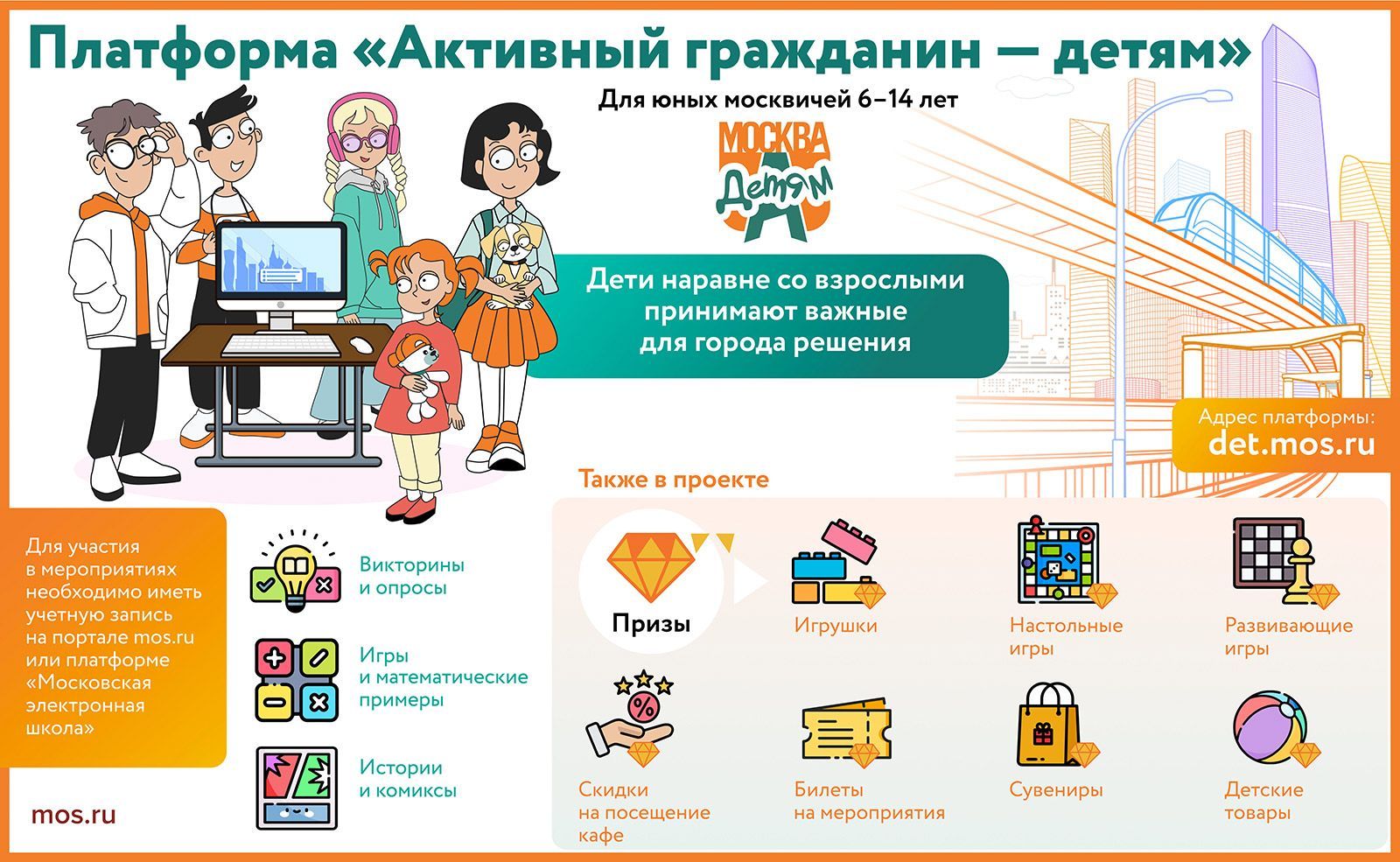 За участие в опросах жители Москвы получают баллы городской программы лояльности «Миллион призов». Эти баллы можно использовать для получения товаров и услуг партнеров программы или отправить на благотворительность. Те, кто переведет городские баллы в любую некоммерческую организацию или детские баллы в фонды помощи животным до 5 апреля включительно, примут участие в акции «Месяц добра» и получат приятный сюрприз. Дополнительную информацию можно найти в материале на mos.ru или на странице акции.