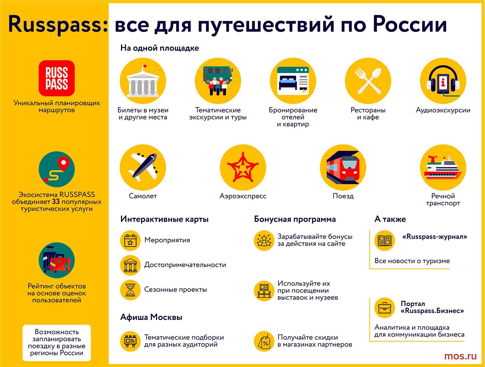 Выбор вариантов для детского и семейного отдыха облегчит раздел «Москва — детям» на сервисе путешествий Russpass. Здесь можно найти рекомендации по посещению театральных спектаклей, музыкальных концертов, цирковых шоу, научных музеев и многого другого. Узнать о программе «Играй в Москву», где собрано девять увлекательных маршрутов по популярным местам столицы, также возможно на этом сервисе. Участники разгадывают головоломки, получают наклейки в музеях, а затем обменивают заполненные карты на призы в туристических центрах «Москва». Игроки Russpass также могут встретить москвариков — персонажей в дополненной реальности маршрутов «Играй в Москву», за поимку которых начисляют бонусы, которые можно обменять на билеты в музей за 10 рублей или использовать для других скидок на товары и развлечения.