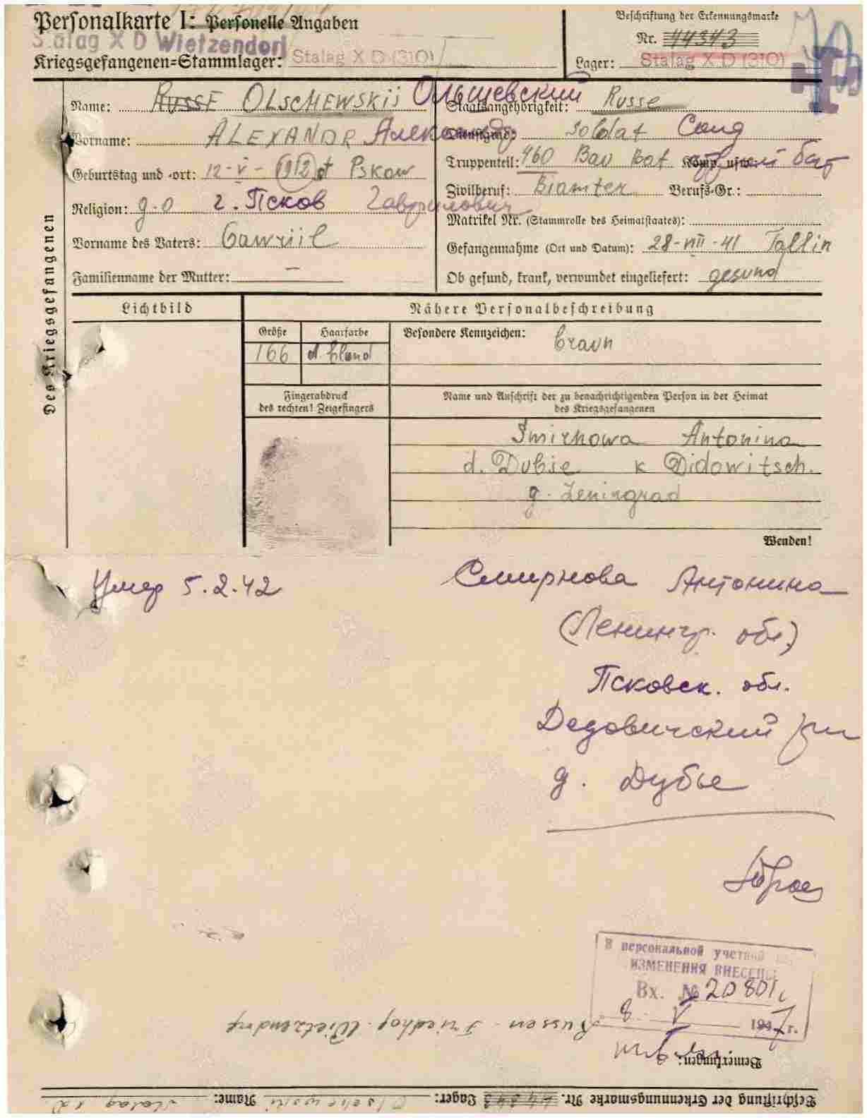 Специалисты Центра сохранения памяти о советских военнопленных выяснили, что солдат Красной Армии Александр Ольшевский попал в плен в Таллине в августе 1941 года. Впоследствии его отправили в лагерь Stalag X D (310) — Витцендорф на Люнебургской пустоши.