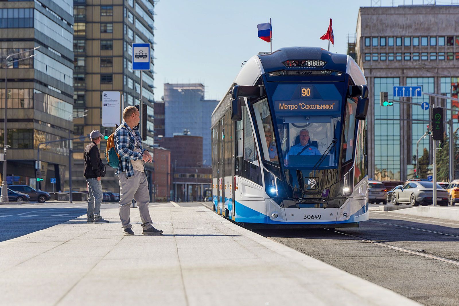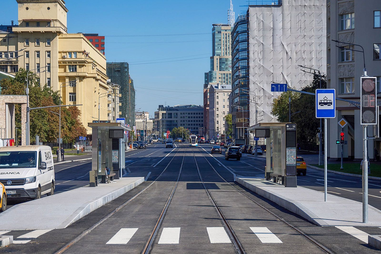 На проспекте Академика Сахарова была построена первая в России трамвайная линия без контактной сети, протяженностью 2,1 километра. Этот проект позволил запустить новый маршрут городского транспорта — Московский трамвайный диаметр Т1, который проходит через центр и соединяет отдаленные районы столицы. Строительство осуществлялось с использованием технологии бесшовной укладки путей на усиленном монолитном основании. Благодаря резиновым виброизолирующим матам удалось обеспечить плавное и бесшумное движение трамваев. Линия расположена на обособленном полотне, отделенном от проезжей части разметкой, что гарантирует бесперебойное движение общественного транспорта при отсутствии помех для автомобилей.
