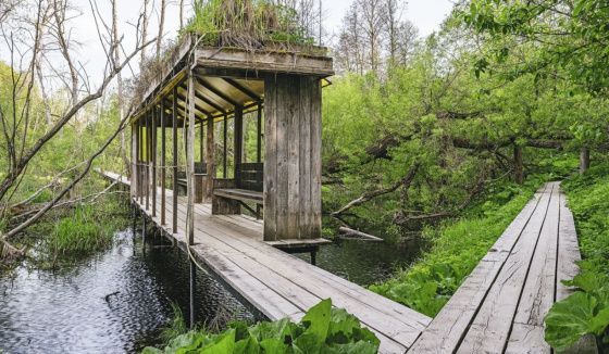 Работы Бродского удивляют своей строгой чистотой и глубокой концептуальностью. Две километра деревянных настилов буквально парят над землей, опираясь на стальные сваи, вбитые в грунт. Это создает ощущение полета, словно из легенд о Фаусте. Особенно завораживает вид ночью: свет, загорающийся под настилами, освещает папоротники и лопухи вокруг, рисуя таинственные тени. В тишине можно услышать, как тропинка пересекается с маршрутом ежика или как лесная мышь в панике скрывается от шагов.