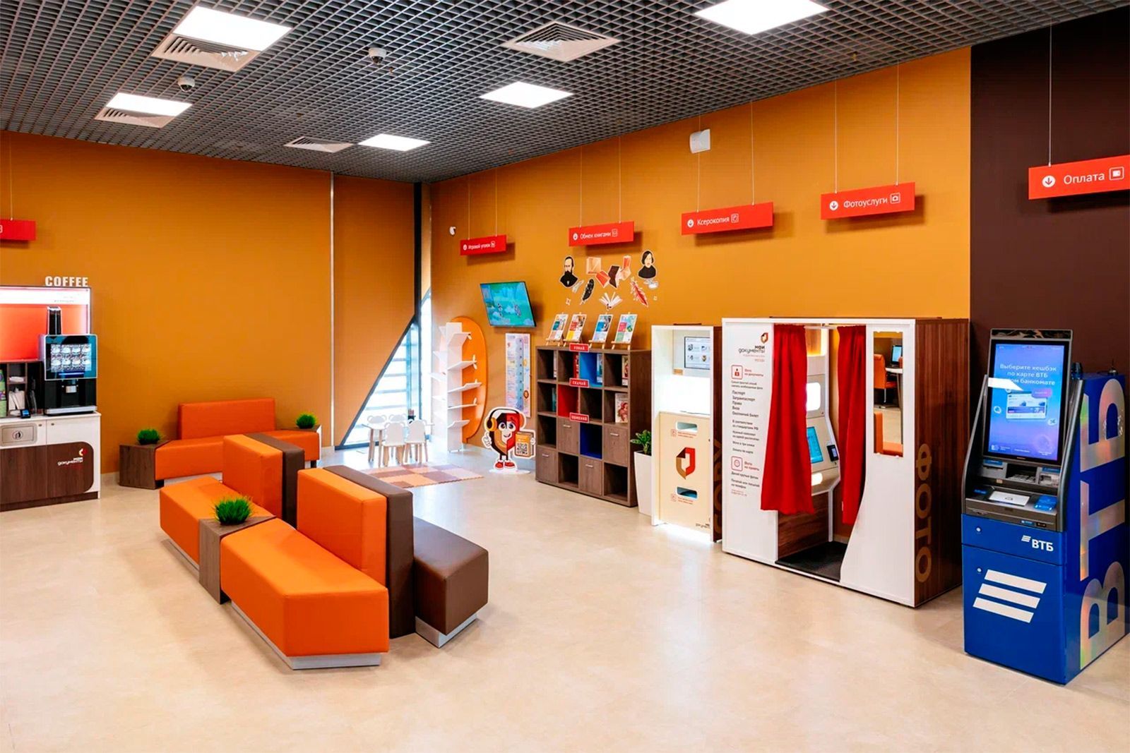 В зоне ожидания офиса посетители могут не только заполнить заявление, но и подзарядить устройства с помощью пауэрбанков или разъемов, выпить кофе и расслабиться. Здесь работают терминалы оплаты, банкоматы, вендинговые аппараты, а также зона обмена книгами. Кроме того, размещен выставочный стенд проекта «Москва — с заботой об истории».