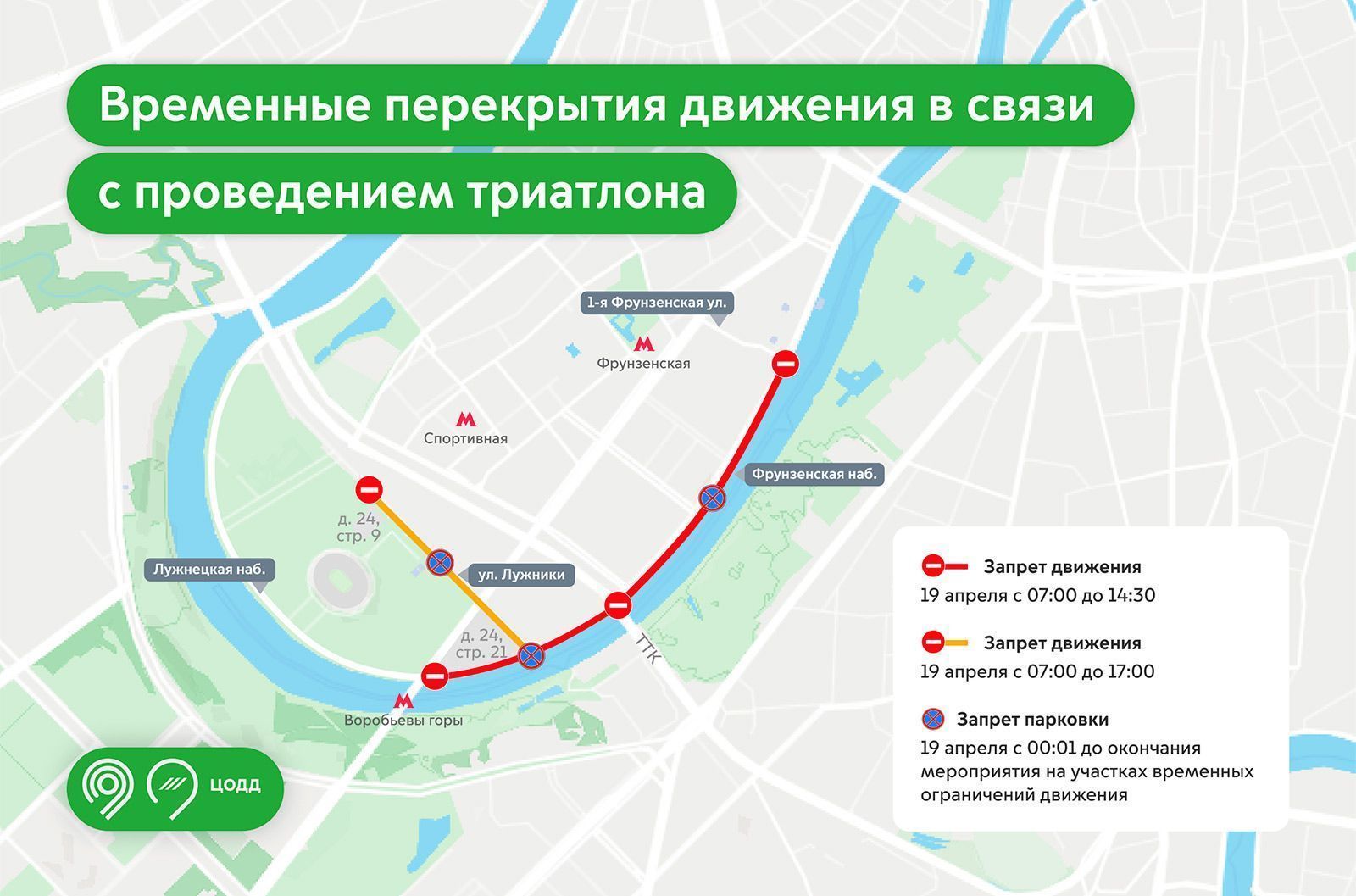 19 апреля в Хамовниках на время проведения триатлонных соревнований будет изменена схема движения транспорта.