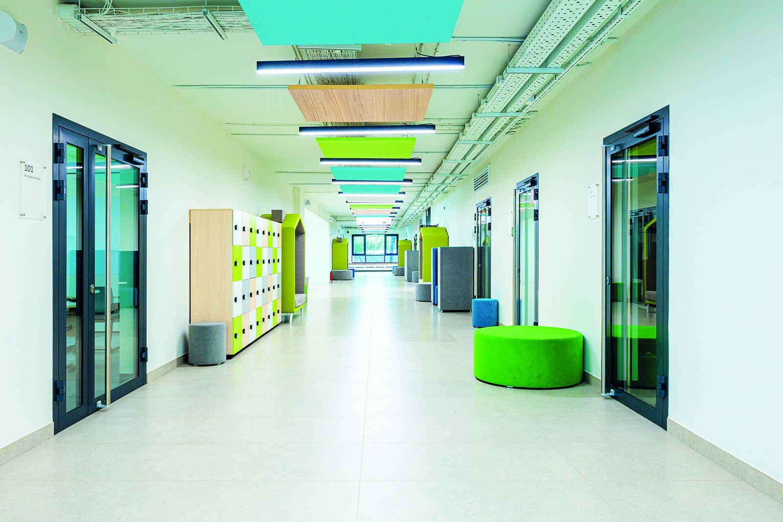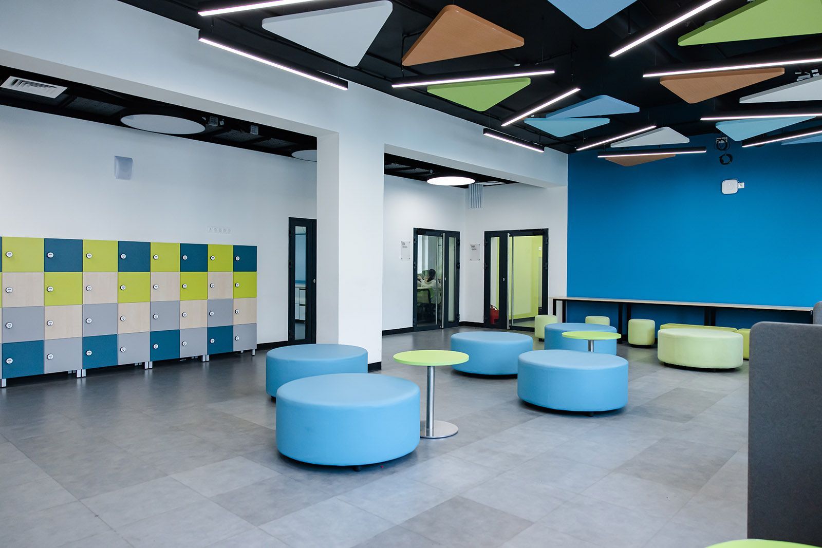 Стены оформляются в светлых тонах с яркими акцентами. В тамбурах и вестибюлях используется светлая плитка под кирпич, в столовых и санузлах – керамическая. После завершения чистовой отделки на лестницах установят многоуровневые перила для детей разного роста. Системы видеонаблюдения и контроля доступа будут выведены на пост охраны. В вестибюлях, коридорах и рекреациях будет размещена мягкая мебель.