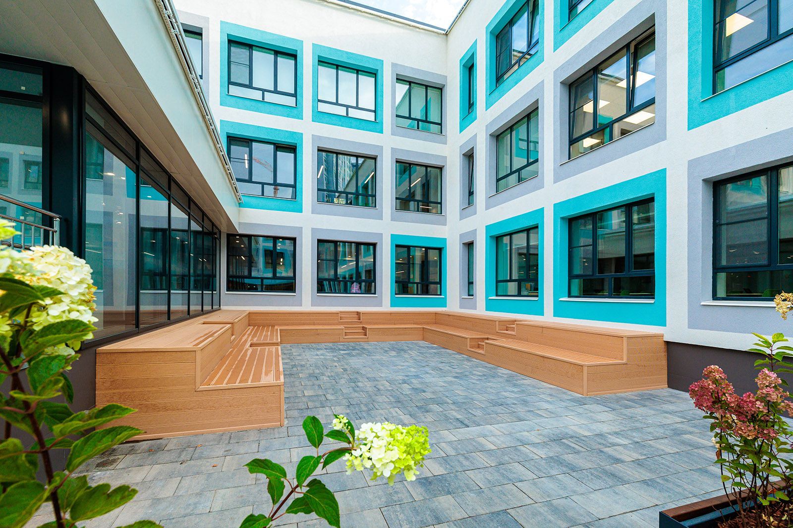 Помимо реконструкции зданий, будет проведено благоустройство пришкольных территорий: обустройство новых водосточных сетей, замена покрытий тротуаров и проезжей части, уборка воздушных кабельных линий под землю. На территории установят системы видеонаблюдения и контроля доступа, заменят ограждение. Также будут обустроены спортивные и игровые зоны, места для отдыха, парковки для велосипедов и самокатов. Для навигации установят информационные стелы и указатели, а также фонари с энергосберегающими светильниками. Территории дополнительно озеленят: разобьют газон и высадят деревья.
