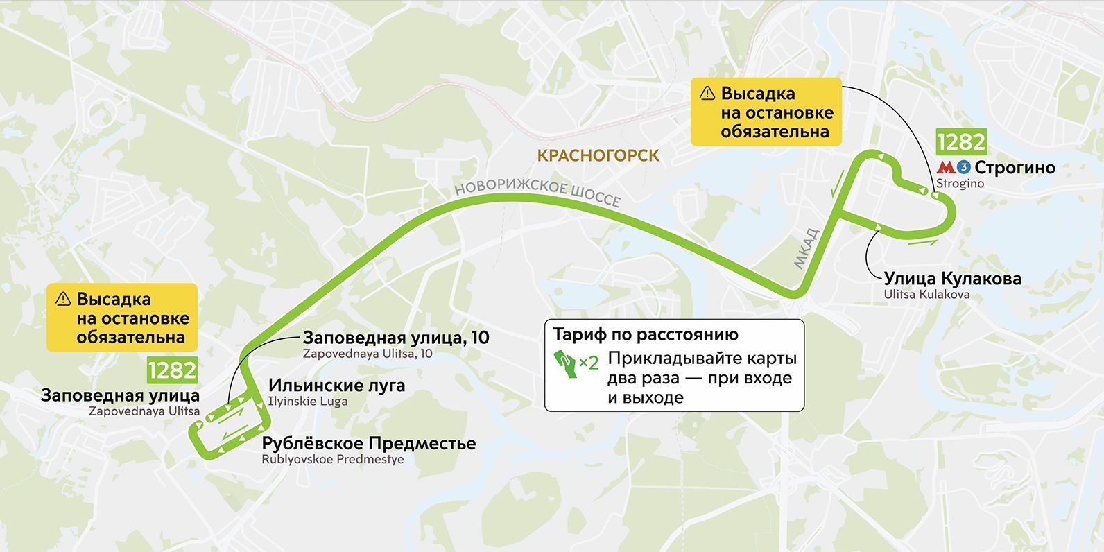 По маршрутам № 1282 и 1580 стоимость проезда зависит от расстояния, карту необходимо прикладывать дважды — при входе и выходе. Поездка с картой «Тройка» будет стоить от 63 до 105 рублей, а с банковской картой — от 64 до 106 рублей.