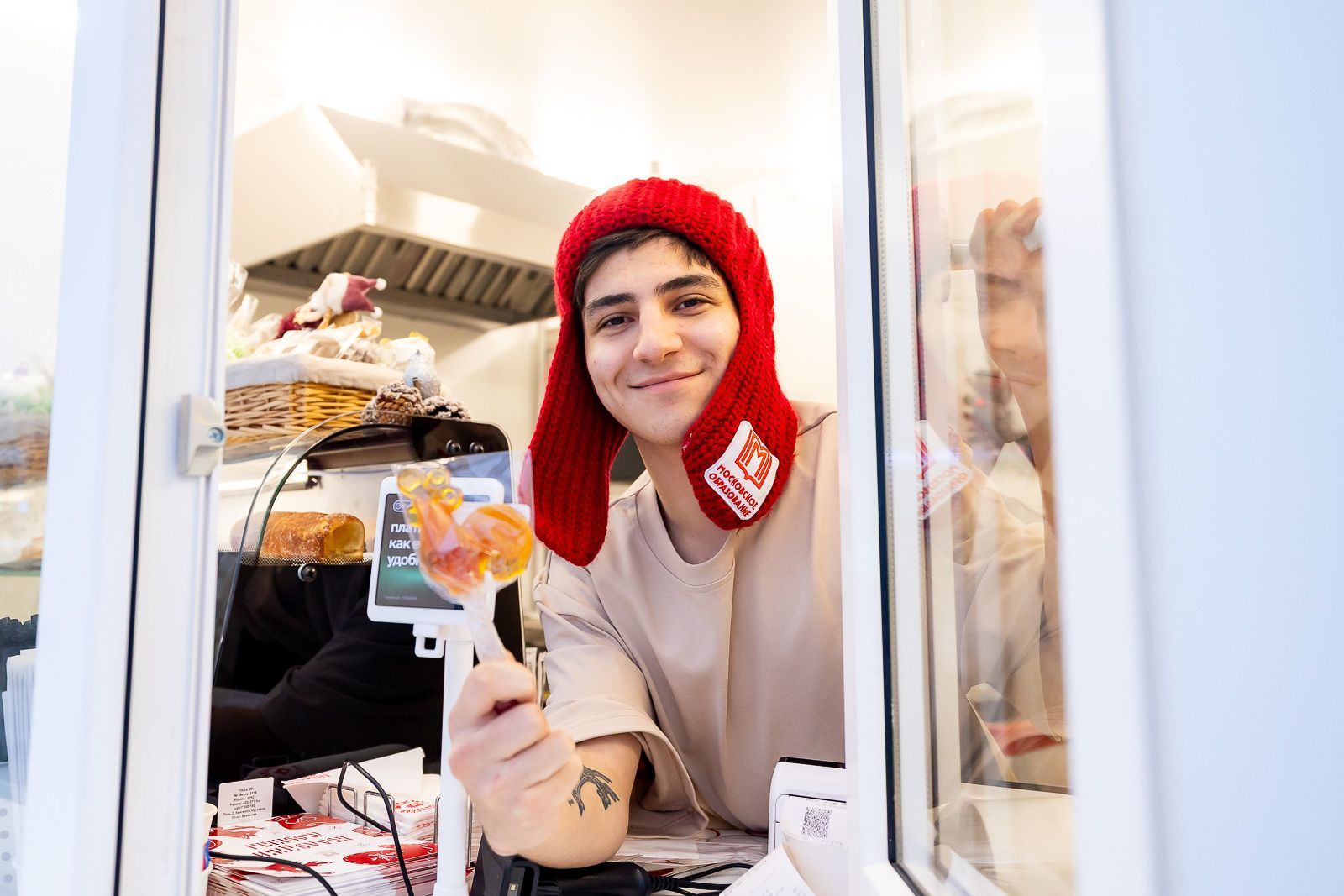 В павильоне колледжа сферы услуг № 10 представлены сладкие угощения. Выбор включает горячие пончики, трдельники, блины, конфеты в подарочных упаковках, леденцы на палочках и зефир со вкусом эскимо. Посетители также могут попробовать шоколадные медианты и макаруны.