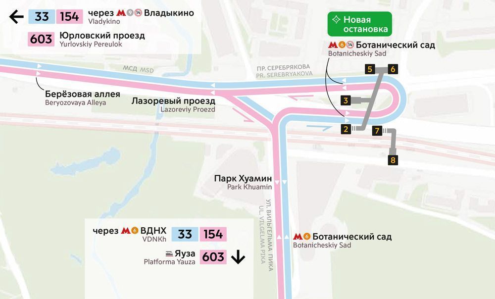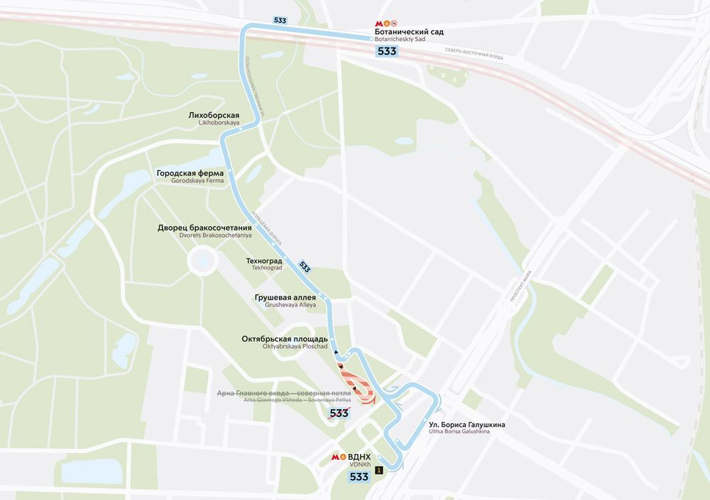 Автобусы маршрута № 33, а также социальные маршруты № 154 и 603, начнут делать заезд к выходам № 2 и 5 станции метро «Ботанический сад» при следовании в сторону района Отрадное. Их маршрут пройдет ближе к станциям метрополитена, Московского центрального кольца, и они будут останавливаться на тех же остановках, что и автобусы маршрутов № 61, 428, 533, 534, 628, социальных маршрутов № 71, 522 и С595, а также ночного автобуса Н6.