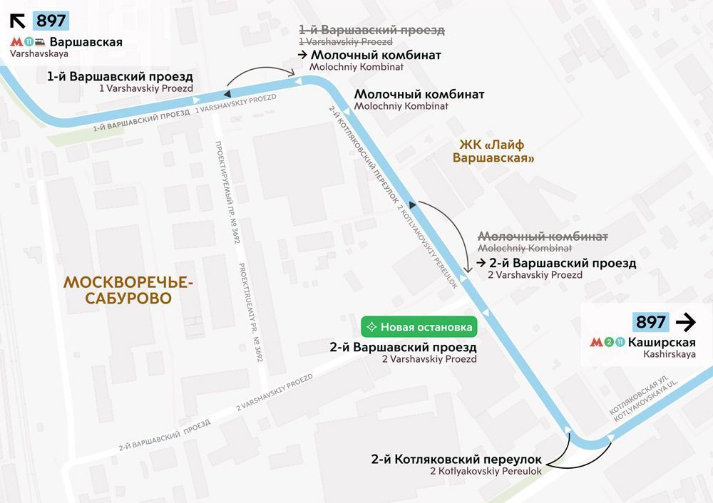 В маршрут № 897 добавлена новая остановка «2-й Варшавский проезд» при движении к станции метро «Каширская».
