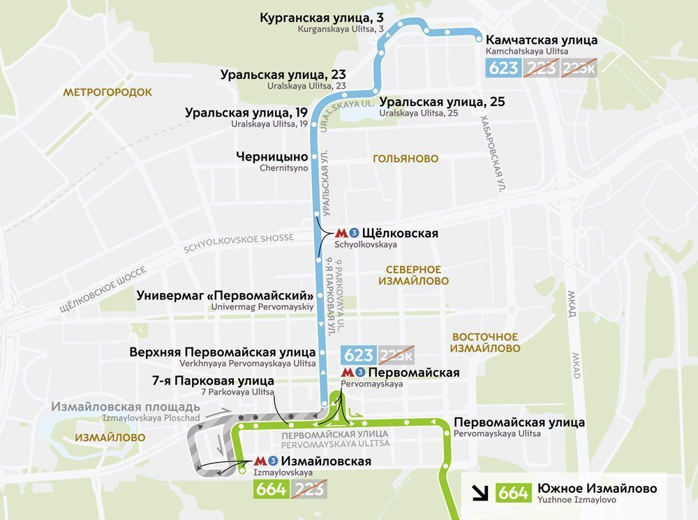 Маршруты № 223 и 223к объединяются в новый районный номер — 623, что повысит частоту движения автобусов. На участке между станциями метро «Первомайская» и «Измайловская» вместо маршрута № 223 теперь можно воспользоваться автобусом № 664 либо Арбатско-Покровской линией метрополитена.