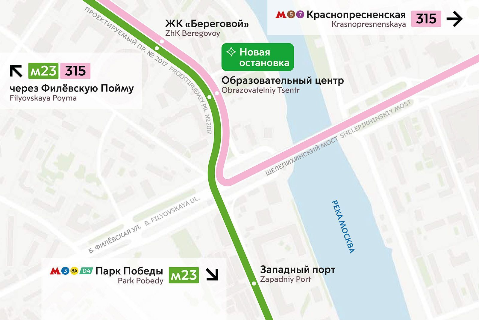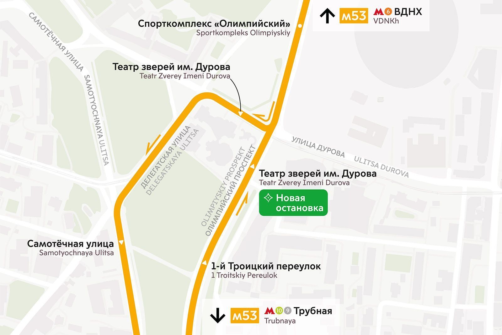 На магистральном маршруте М23 и социальном № 315 появляется новая остановка «Образовательный центр», а для магистрального маршрута М53 добавляется остановка «Театр зверей имени Дурова» на Олимпийском проспекте.