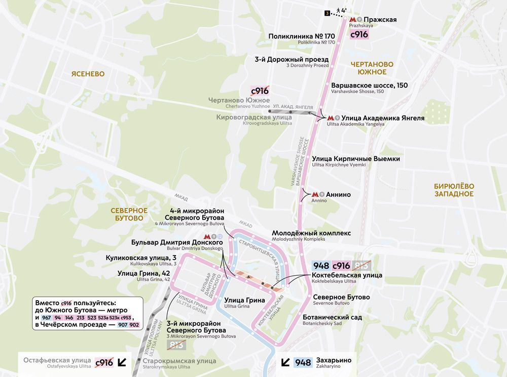 Маршруты С916 и № 813 объединяют в новый: он будет проходить по Старобитцевской улице, бульвару Дмитрия Донского, а также по улицам Грина, Куликовской, Знаменские Садки, Старокачаловской, Коктебельской и далее по Варшавскому шоссе.