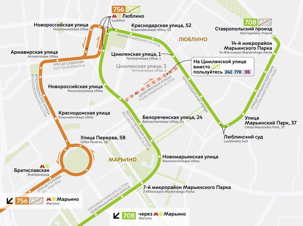 Районный маршрут № 708 теперь будет проходить по улицам Совхозная, Краснодарская и Марьинский Парк, а не по Цимлянской улице, довозя пассажиров до Ставропольского проезда.