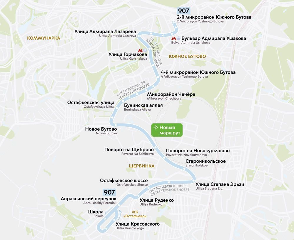 В жилом комплексе «Остафьево» запускается новый районный маршрут № 907, который обеспечит удобное сообщение с Бутовской линией метро и социальными объектами.