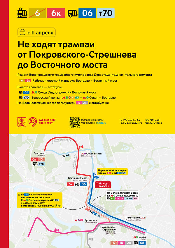 Временно вместо маршрута трамвая № 6 будет функционировать короткий маршрут № 6к "Братцево" — "Восточный мост". Поскольку современные вагоны требуют особенного технического обслуживания, на маршруте будут работать трамваи предыдущего поколения с переменным уровнем пола. Когда строительные работы завершатся, современные вагоны "Витязь-Москва" вернутся на маршруты № 6 и 6к.