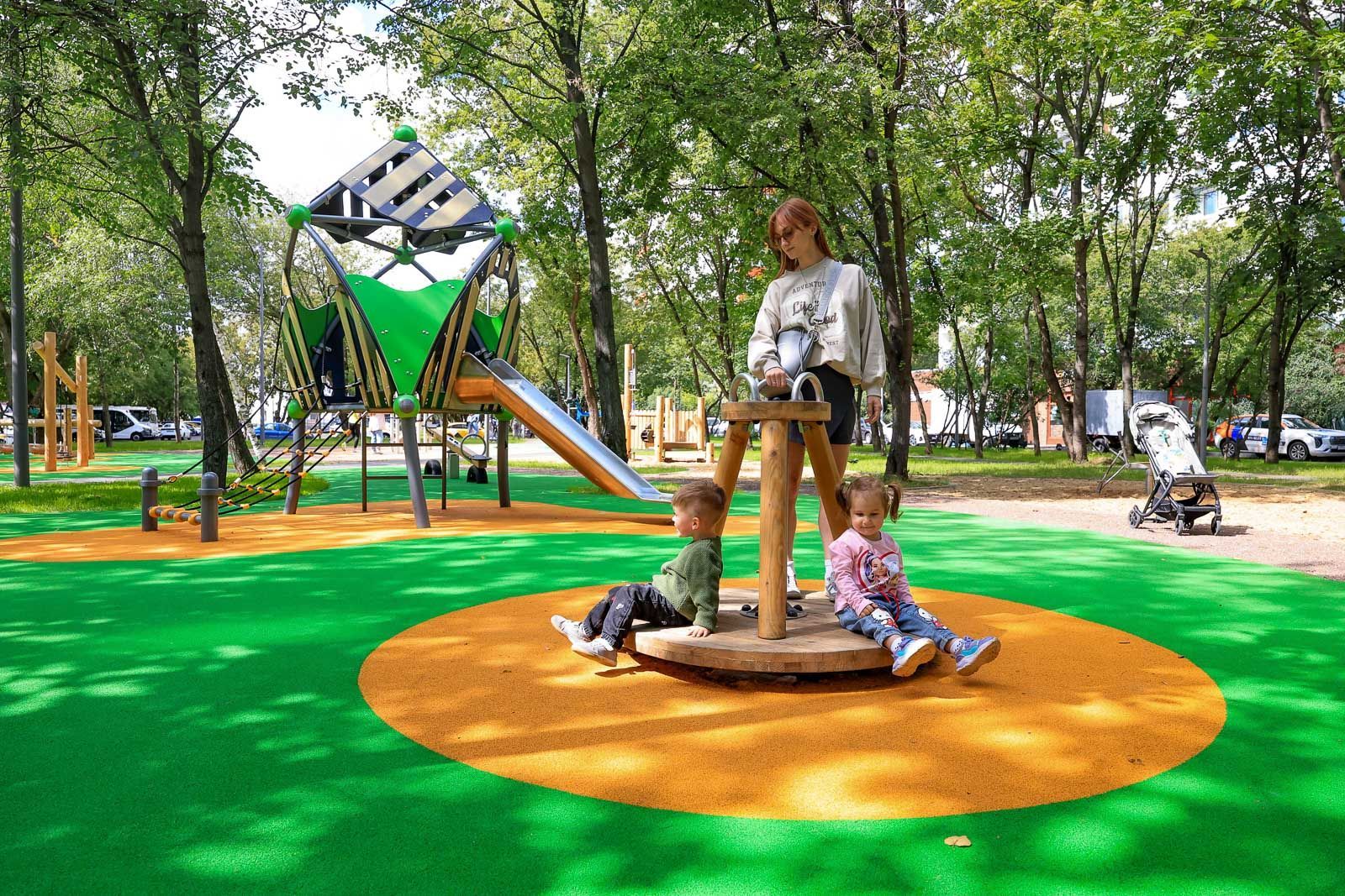 Кроме того, в сквере появился песочный городок и игровой комплекс с горкой и канатами, напоминающий космический корабль, а также карусели и качели-балансиры. Комплекс осветила современная система, а территорию снабдили новым газоном и деревьями.