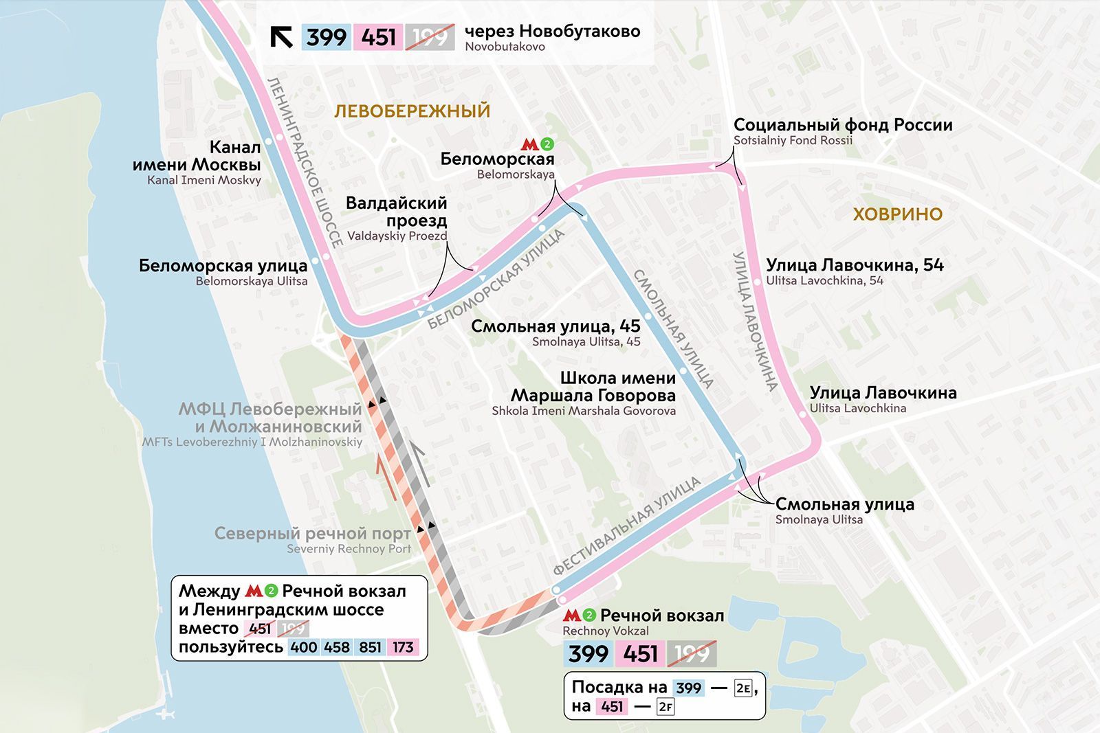 Социальный автобус № 451 прекратит движение по Ленинградскому шоссе на определенном участке и в дальнейшем будет курсировать в обе стороны по улицам Беломорская, Лавочкина и Фестивальная.