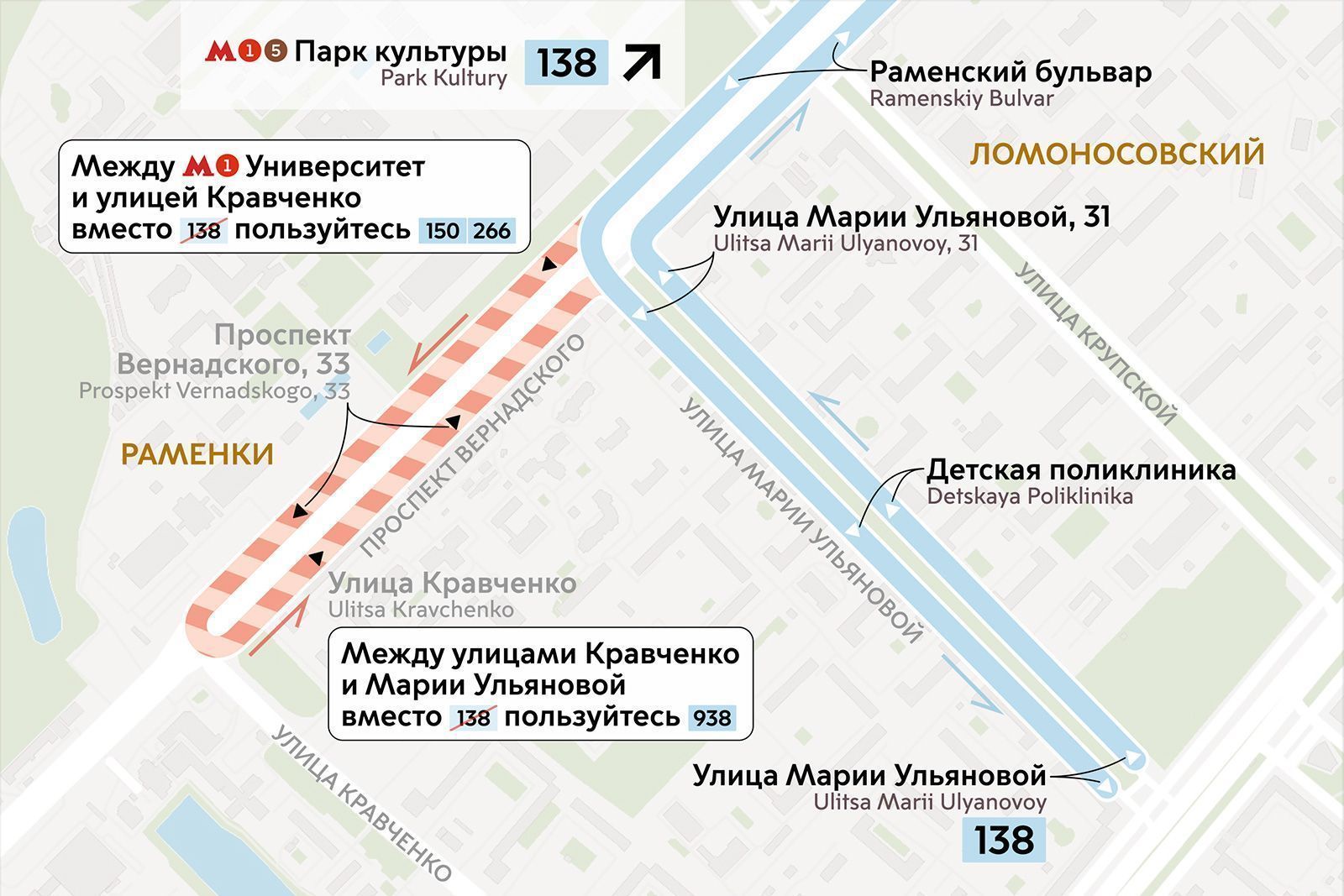 Так, районный автобус № 138 больше не будет подходить к улице Кравченко. Жители улицы Марии Ульяновой смогут добираться быстрее до станции метро «Университет».