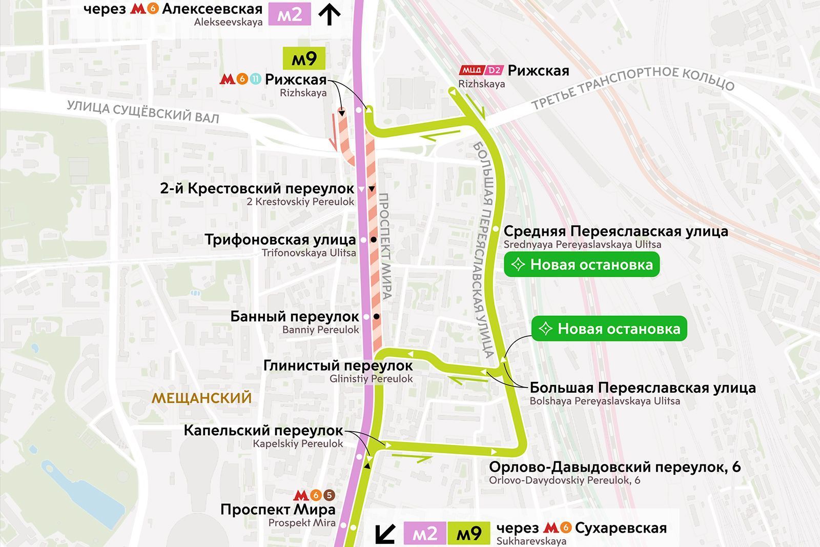 Автобусы М9 теперь следуют по Большой Переяславской улице. Это облегчит поездки до станций метро, МЦД и социальных объектов на магистральном маршруте.