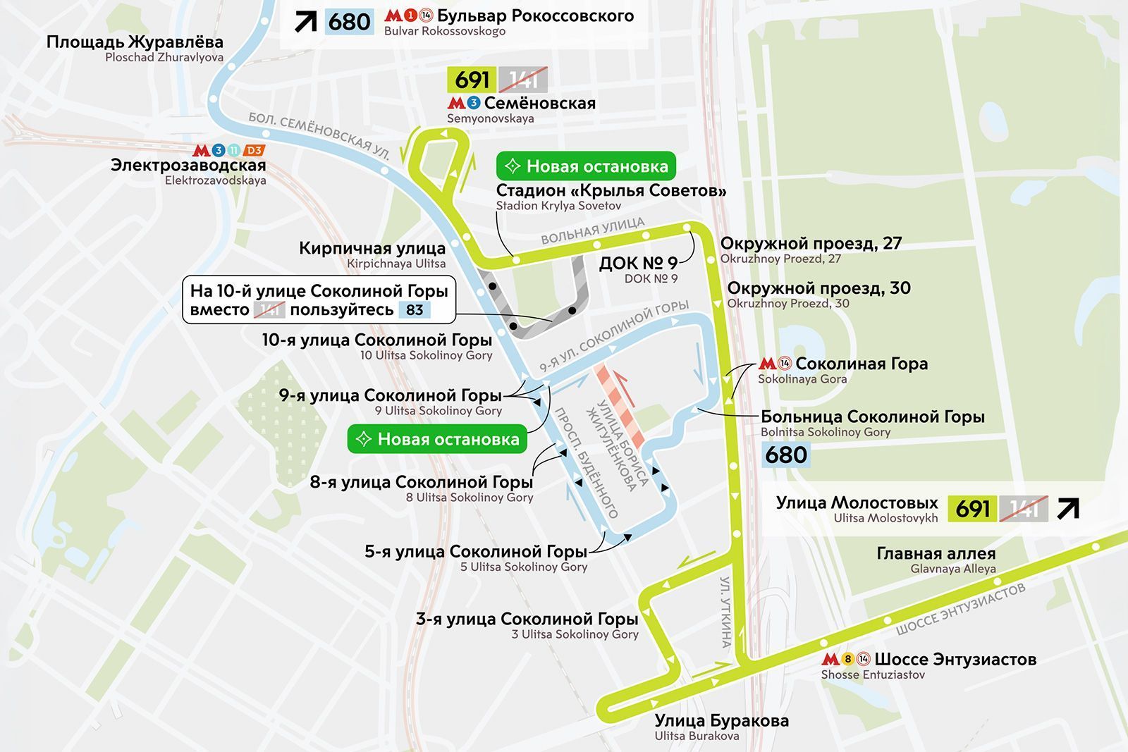 Автобус № 680 в направлении остановки «Больница Соколиной Горы» начнет следовать по всей 9-й улице Соколиной Горы, минуя часть проспекта Буденного, 5-ю улицу Соколиной Горы и улицу Бориса Жигуленкова.