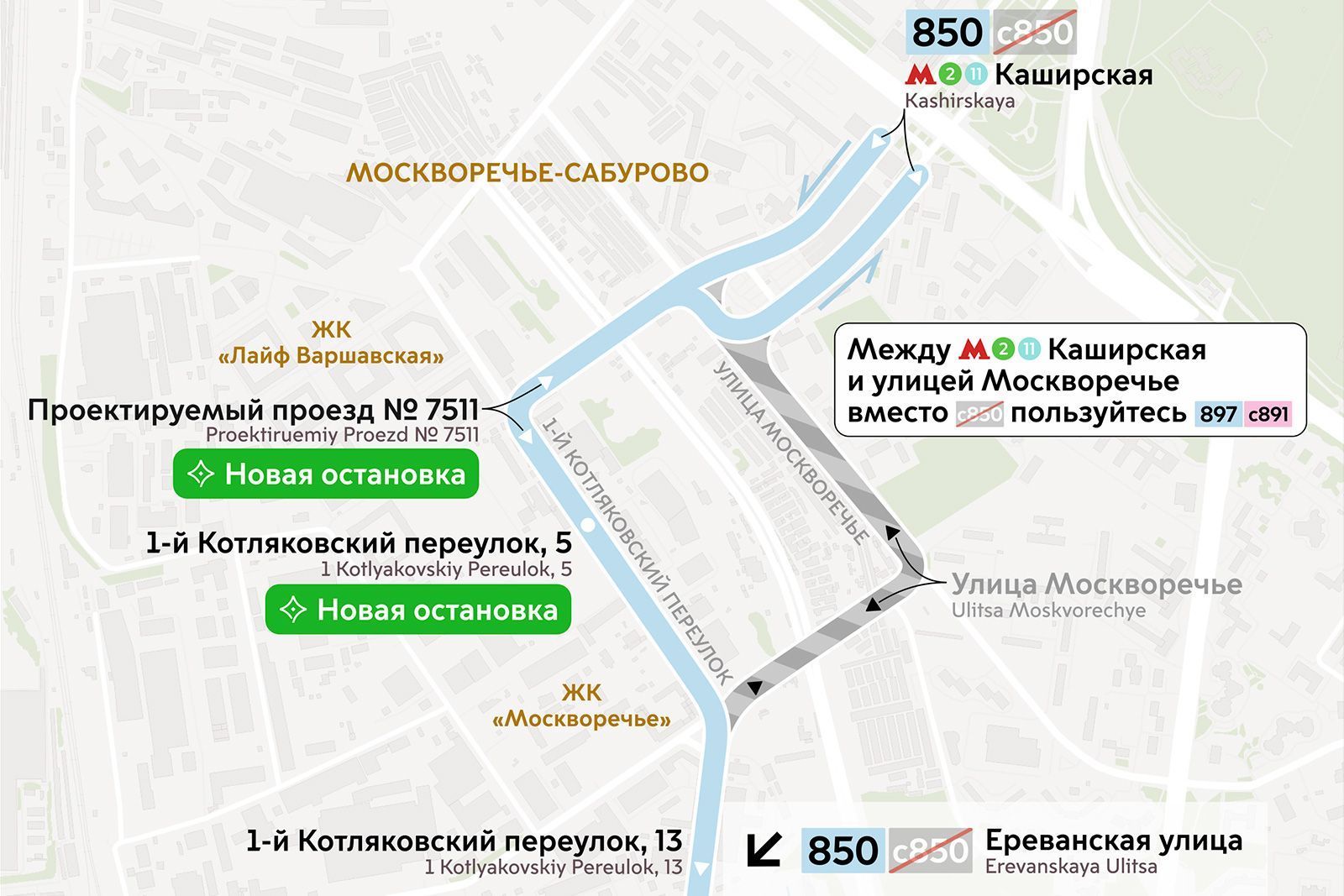 Социальный автобус С850 будет преобразован в маршрут № 850, который, минуя улицу Москворечье, начнет следовать по 1-му Котляковскому переулку, что облегчит жителям новых домов доступ к метро.