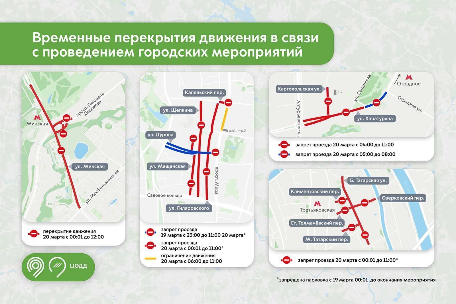 Основные ограничения будут действовать 20 марта. С 00:01 до 11:00 перемещение будет невозможно по улицам Щепкина (между Самарской улицей и Садовым кольцом), Мещанская (от Садового кольца до улицы Дурова), и Гиляровского (от Капельского переулка до Садового кольца). Перекрытия затронут также переулки: Выползов (от улицы Дурова до дома 10) и Капельский (от проспекта Мира до улицы Гиляровского).