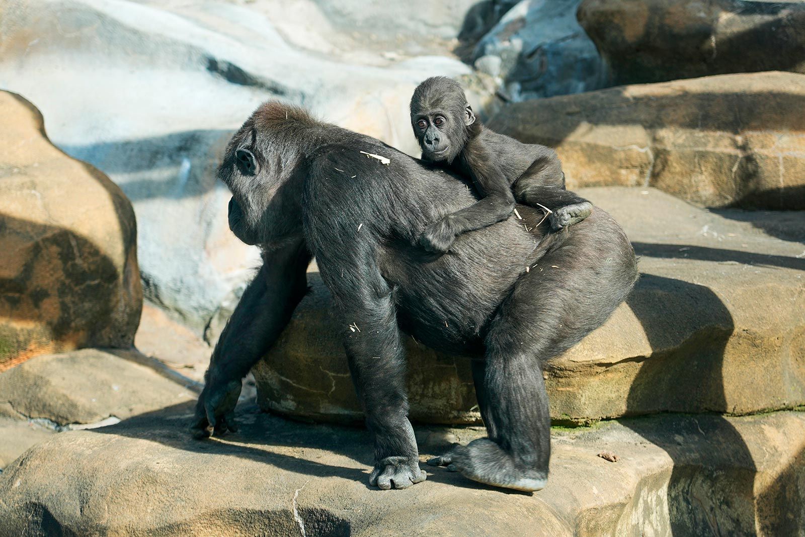 Среди млекопитающих, вышедших на открытые площадки, оказались и равнинные гориллы. Посетители смогут встретить самца Визури, самку Киру и их маленького Квито. Зоологи постепенно добавляют в его рацион взрослую пищу: зелень, веточный корм, свежие овощи, молочные продукты, орехи, семечки и сухофрукты.