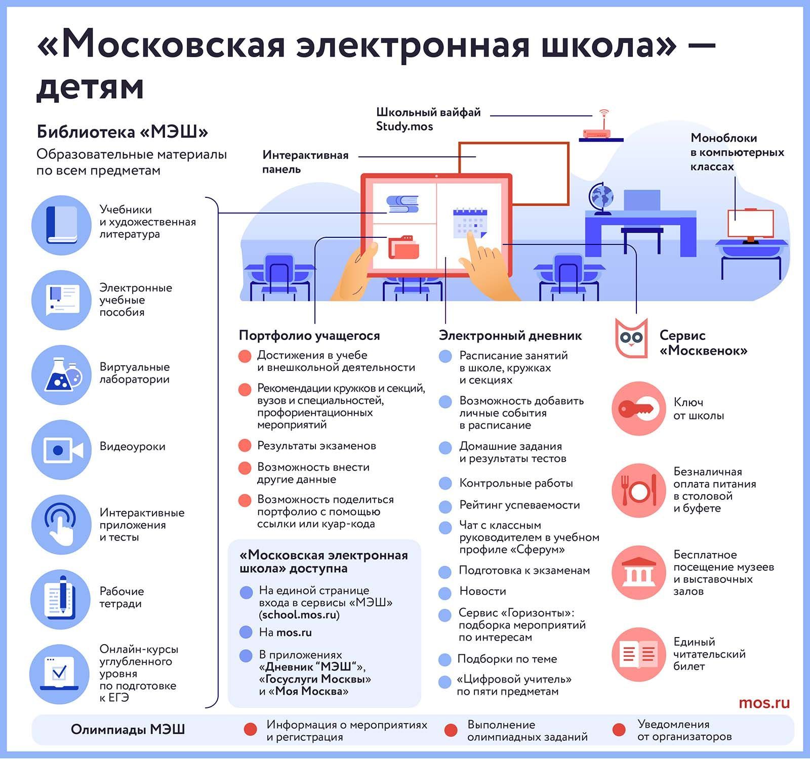 «Московская электронная школа» — совместная инициатива столичного Департамента образования и науки и Департамента информационных технологий города Москвы, запущенная в 2016 году. Сегодня эта единая цифровая образовательная платформа обслуживает более 1,2 миллиона школьников, свыше 1,8 миллиона родителей и около 70 тысяч педагогов. Среди ключевых сервисов «МЭШ» - библиотека учебных материалов, электронные дневник и журнал, «Москвенок», «Портфолио учащегося» и «Олимпиады».