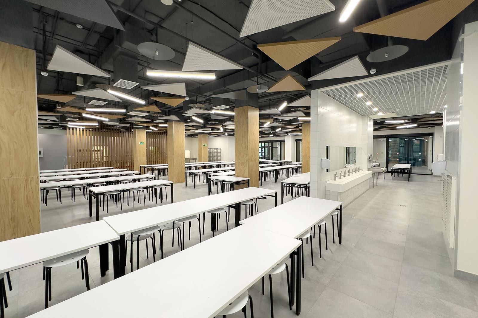 В школе разместили универсальные и специализированные учебные кабинеты, медиатеку, спортзал, медицинский блок, а также пространства для проведения мероприятий и другие необходимые административные и технические помещения.