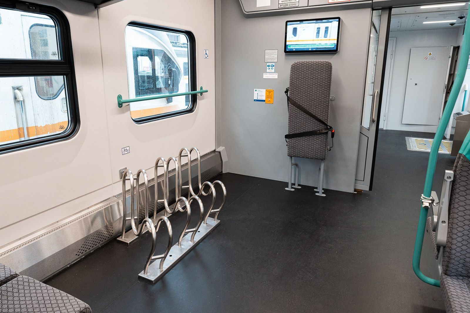В вагонах над дверями появились табло выхода, доработаны велосипедные стойки, добавлены прислонные накладки для стоячих пассажиров и урны для мусора в тамбурах. В санитарных помещениях изменилось расположение элементов, установлено бесконтактное оборудование, а для пассажиров с детьми предусмотрен пеленальный столик.