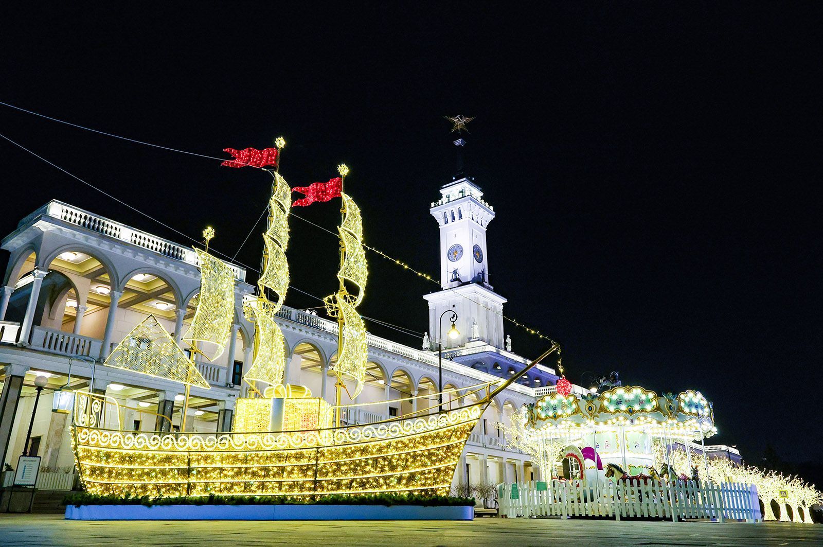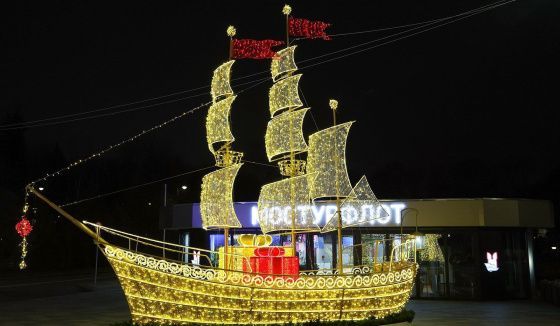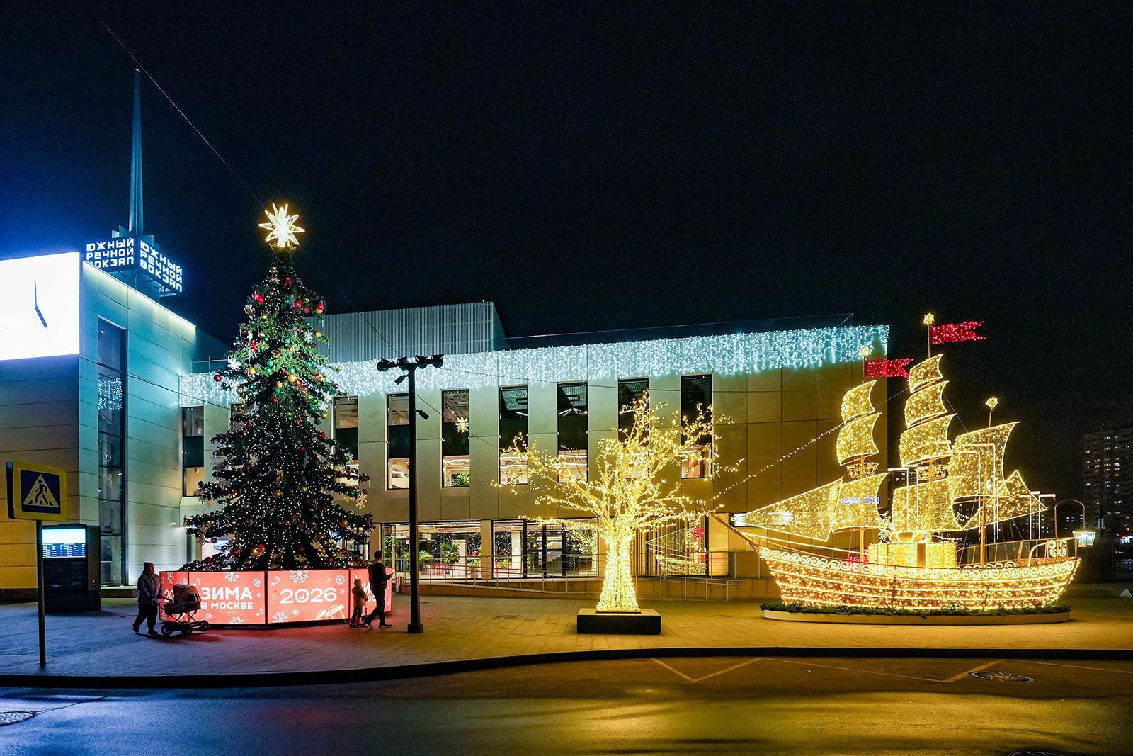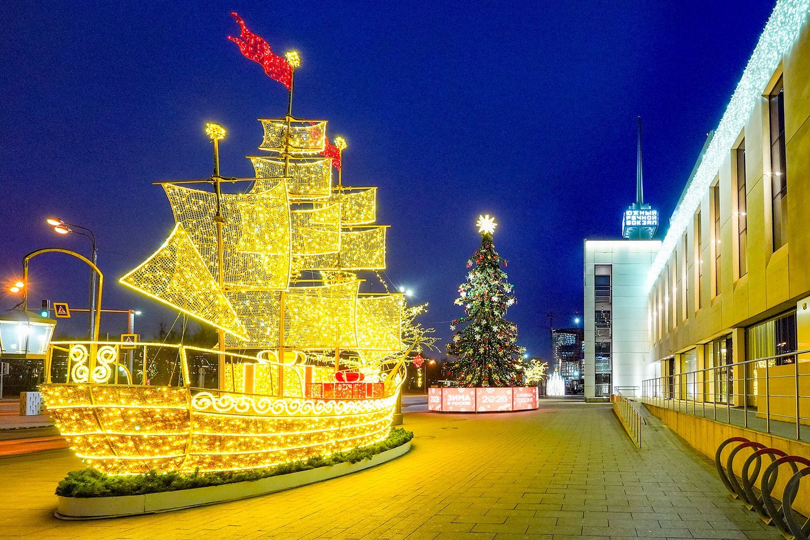 «Тематические конструкции представляют собой корабли с парусами, наполненными ветром. На их палубах разместили новогодние подарки. Длина каждого судна достигает 10 метров, они декорированы яркой светодиодной подсветкой. Фрегаты установлены возле зданий вокзалов. Рядом с ними поставлены новогодние ели, украшенные разноцветными шарами, звездами, светящимися гирляндами и другими элементами декора. На Северном речном вокзале также появились световые деревья», — отметил Петр Бирюков.