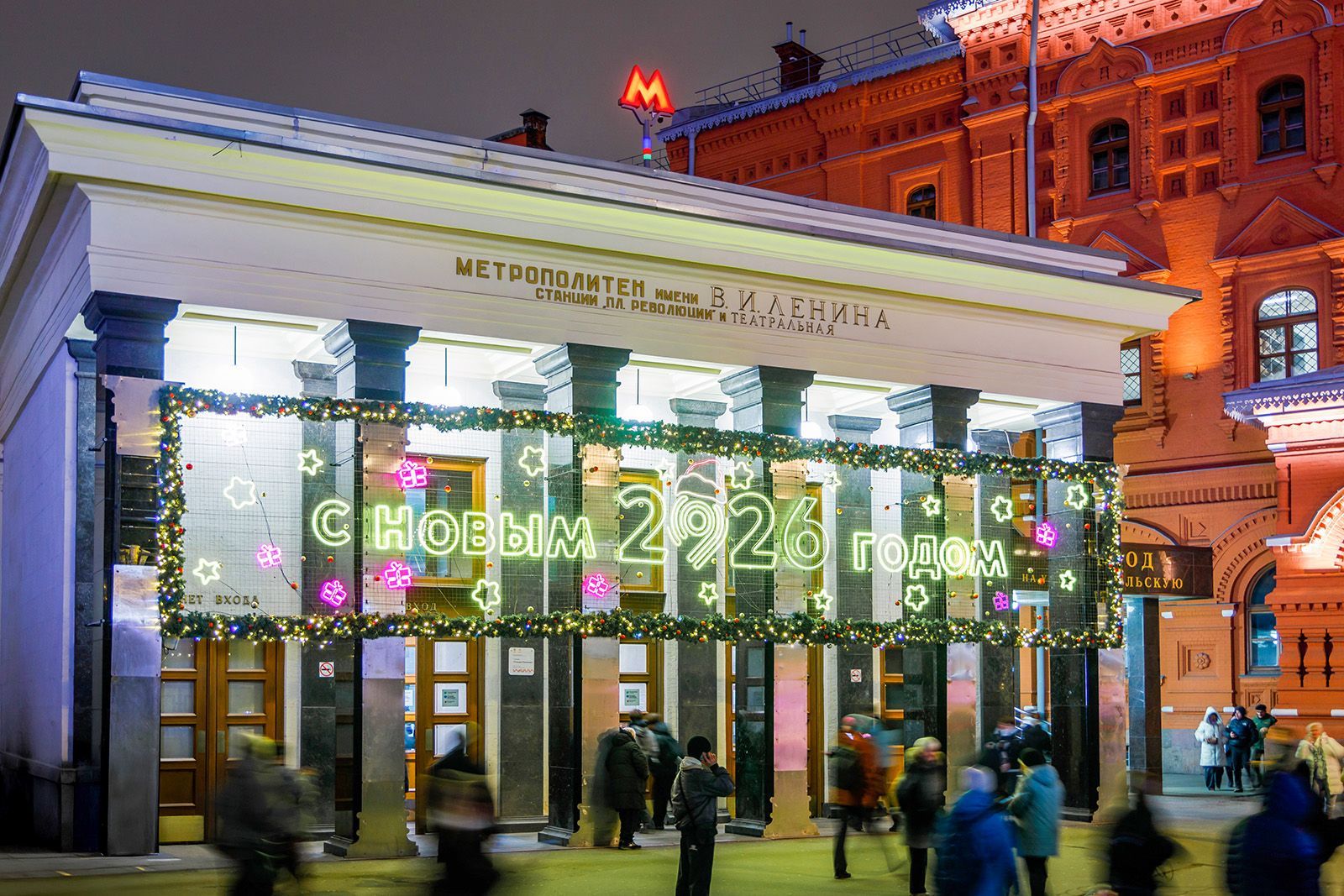 Транспортная система Москвы готовится к Новому году. На фасадах шести станций метро установлены более 100 неоновых праздничных символов, таких как подарки и звезды, а также крупная поздравительная надпись.