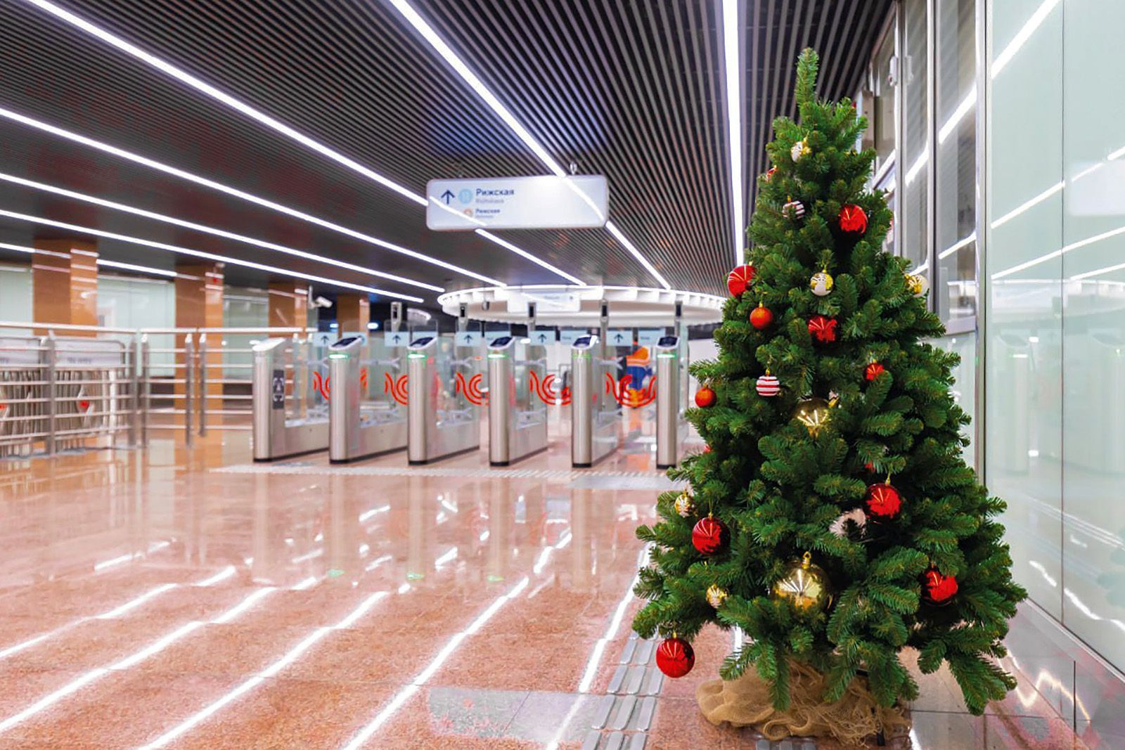 Традиционные новогодние елки установлены на более чем 40 станциях метро и восьми станциях Московских центральных диаметров. Самое большое количество елок находится на станциях Кольцевой линии. Нарядные деревья также создают праздничное настроение на 15 станциях МЦК и на всех пяти автовокзалах. Москвичи и гости столицы смогут наслаждаться новогодним оформлением до конца праздничных каникул.