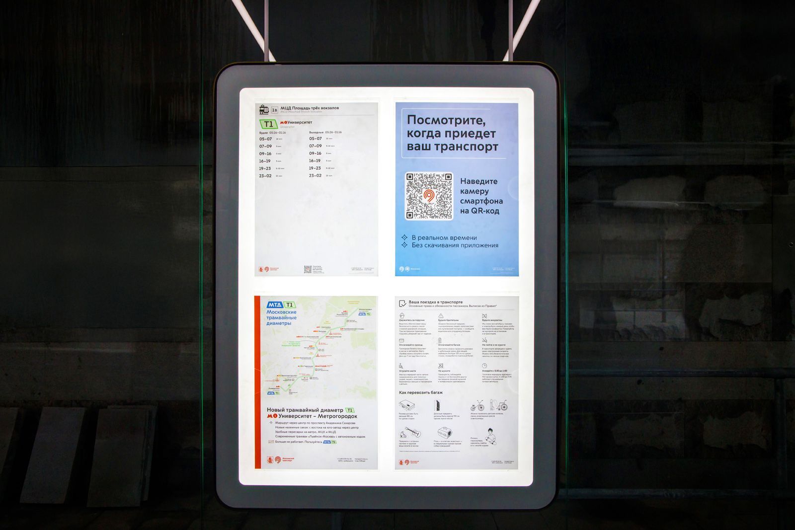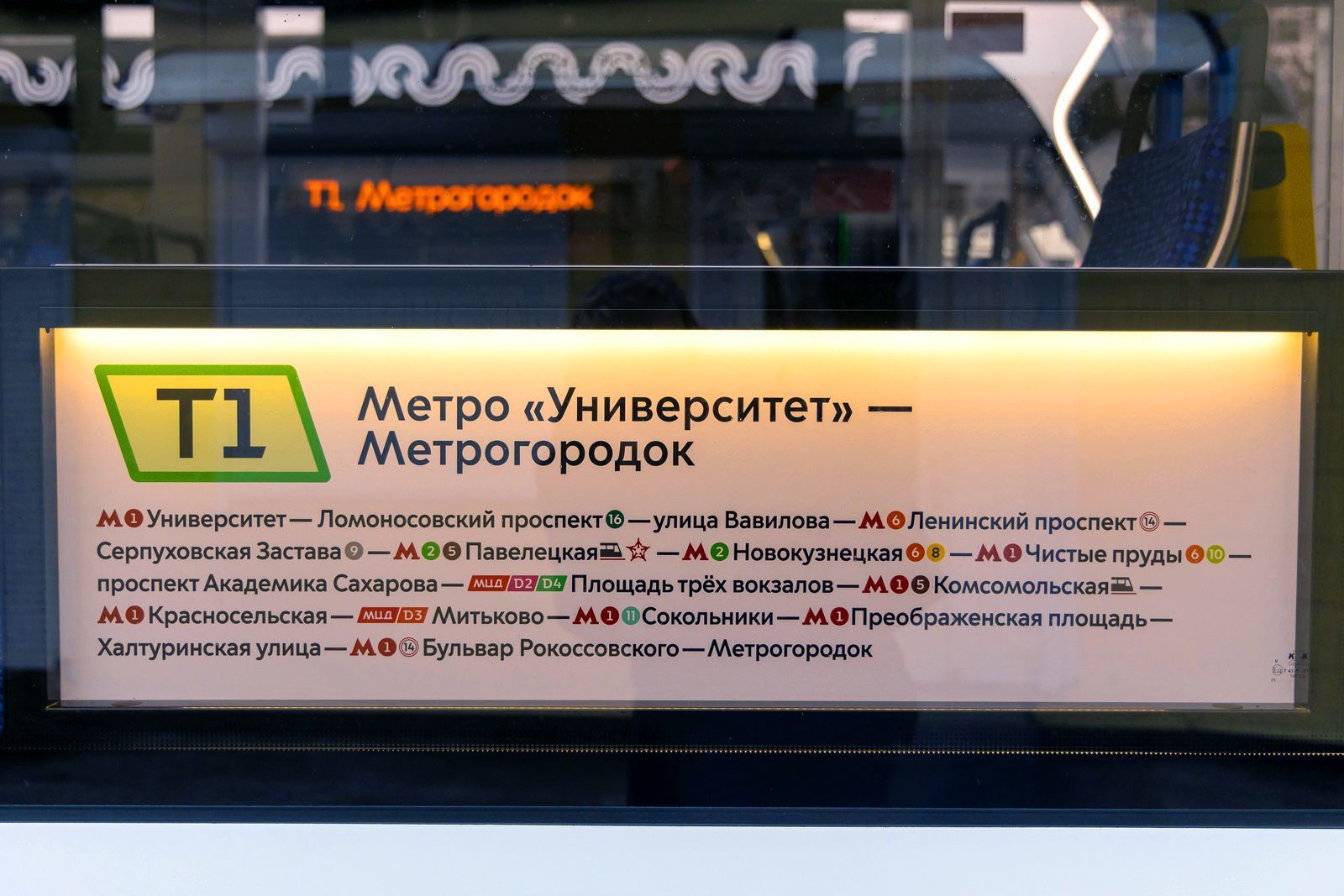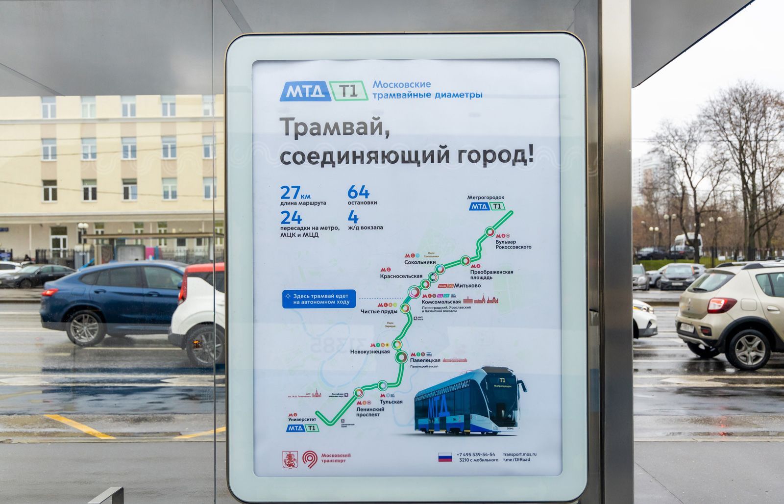 На остановках разместили плакаты с информацией о частоте движения и карте маршрута. Пассажиры узнают, мимо каких ключевых объектов проходит первый Московский трамвайный диаметр, и на какие станции метро и МЦД можно пересесть. На цифровых табло теперь отображается время прибытия трамвая, включая маршрут Т1.