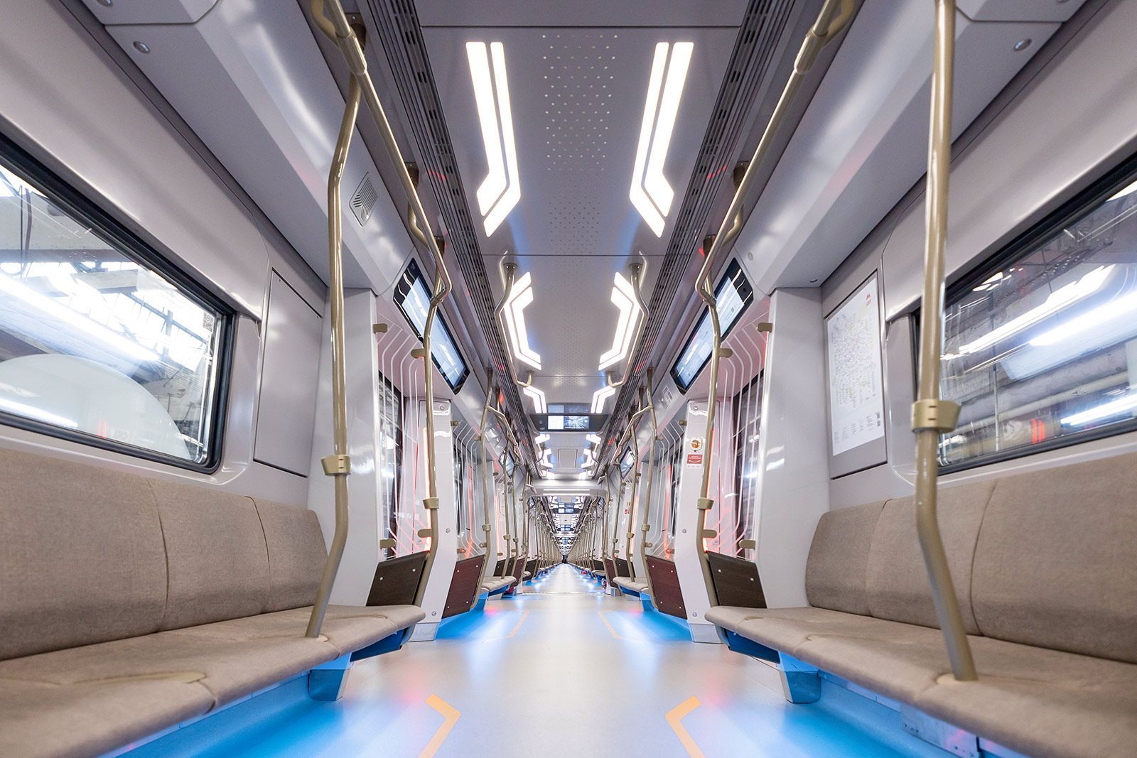 Интерьер беспилотного состава напоминает пассажирам поезд «Москва-2024»: удобные сиденья, изогнутые поручни, расширенные переходы и двери между вагонами, разъемы для зарядки, интерактивные схемы и медиаэкраны. Во время тестирования в кабине машиниста добавлен интерфейс, показывающий расписание движения, а также экран для данных с датчиков машинного зрения.