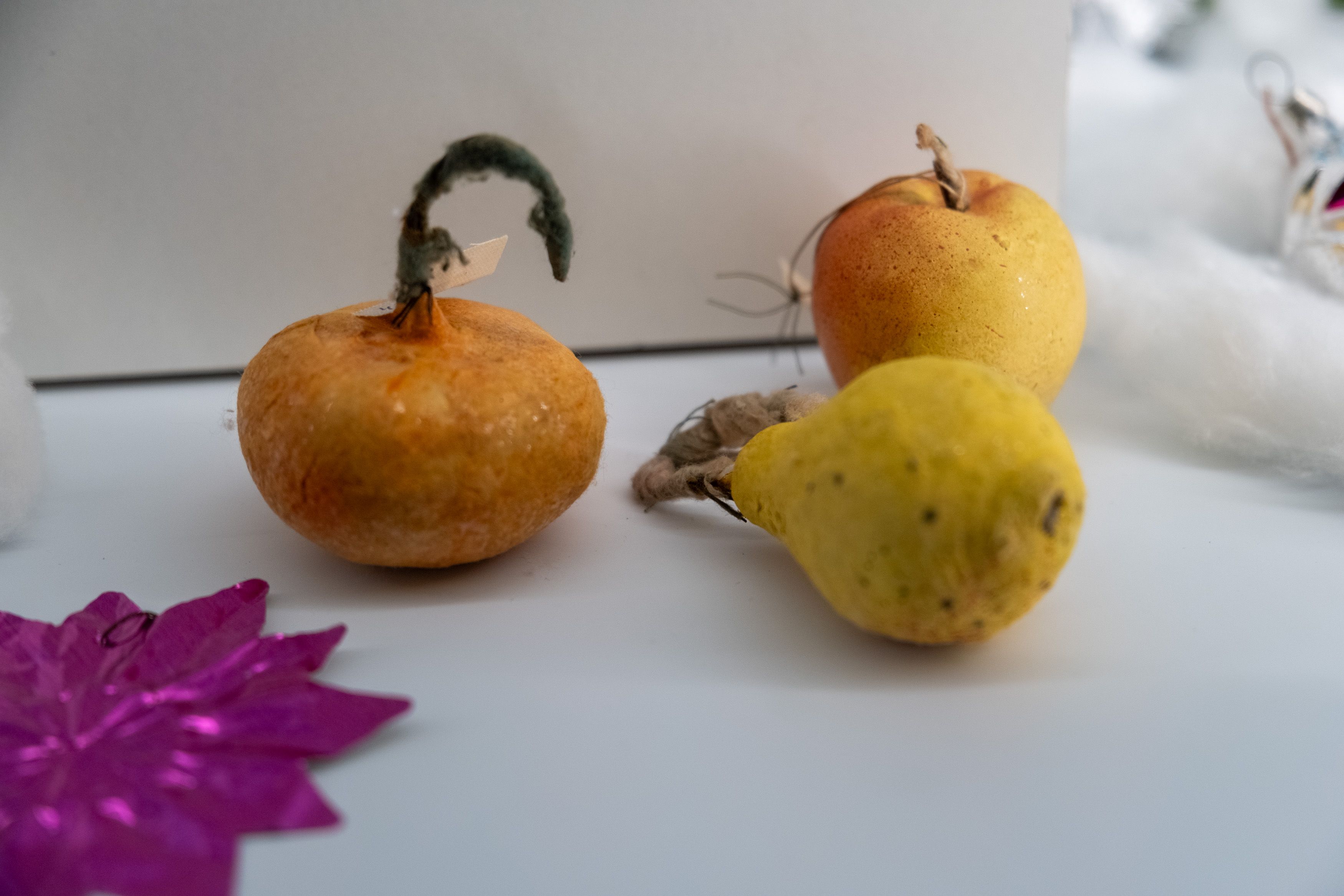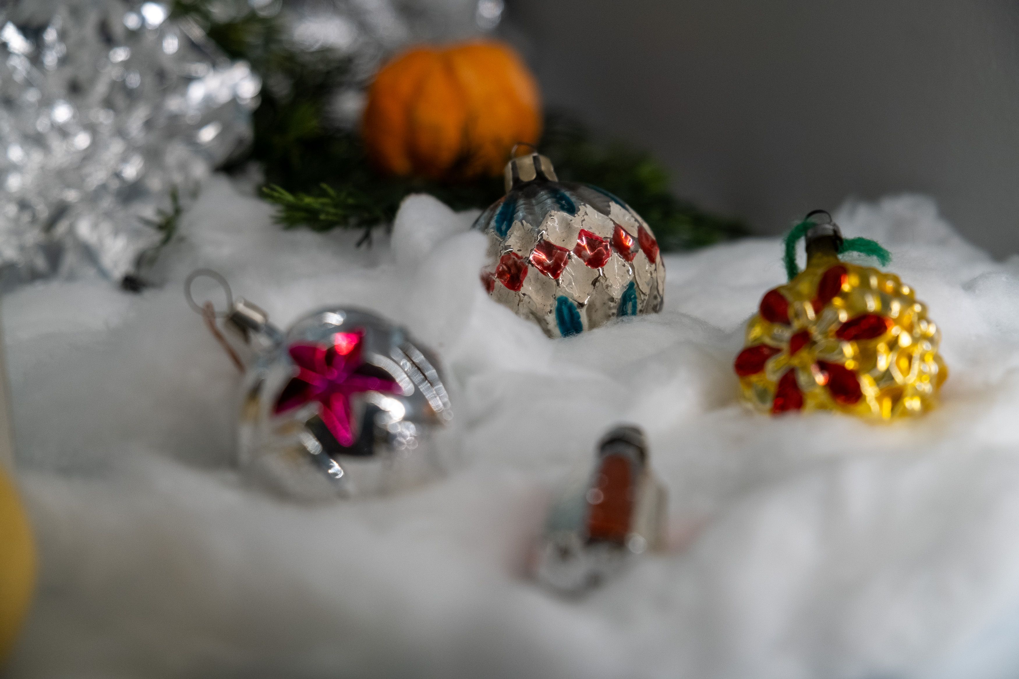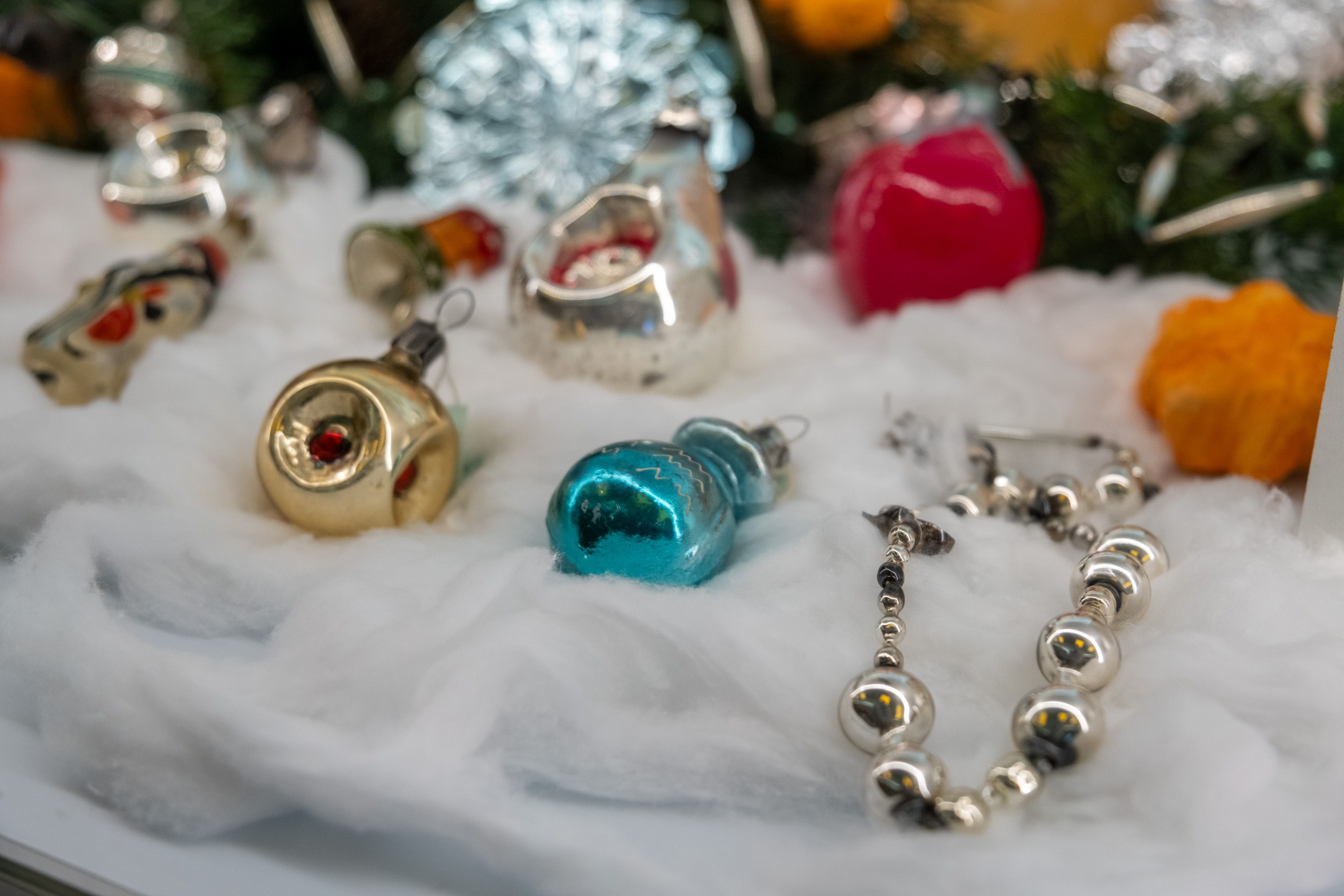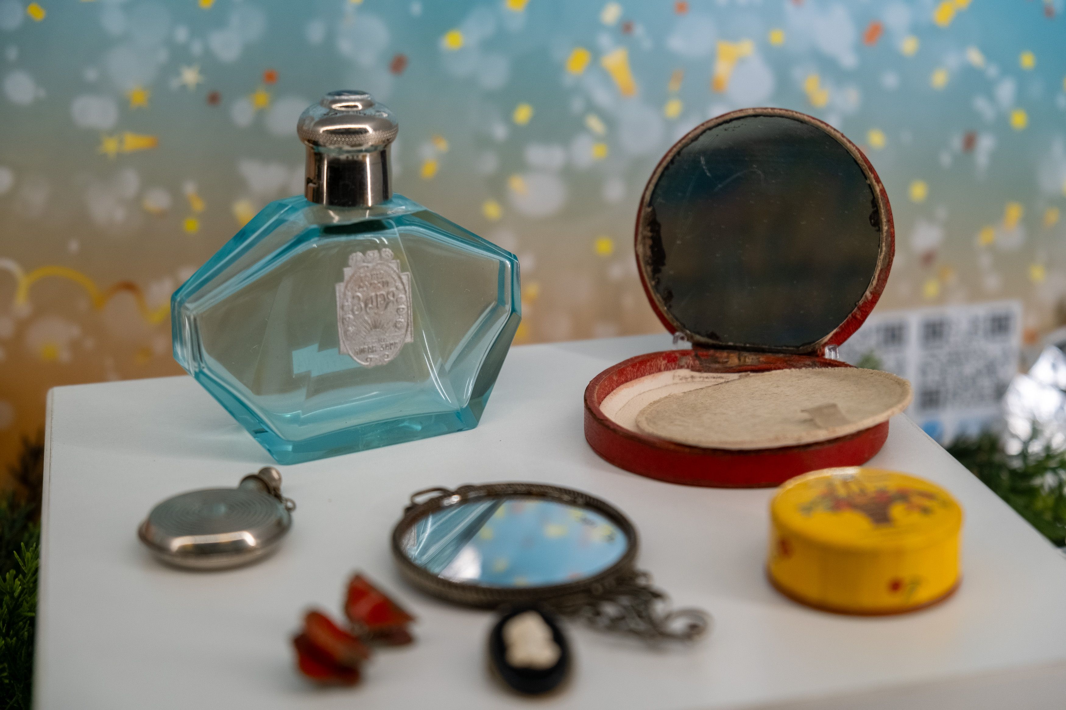 "Гости музея могут увидеть ёлочные украшения 1940-1960-х годов — стеклянные бусы, игрушки из стекла, ваты и фольги, а также праздничные бумажные флажки и хлопушку. В дополнение к этому, представлены мужские и женские аксессуары, ставшие обязательными атрибутами подготовки к празднику — пудреницы, броши и флаконы для духов. Среди редких экспонатов — румяна «Fard En Beaute», принадлежавшие заслуженной артистке РСФСР Лидии Колесниковой. Экспозицию завершает граммофон, созданный в послевоенный период на Ленинградском заводе «Северный пресс», и пластинка с русскими народными песнями «Зимушка, зима» и «Ласточка» в исполнении Государственного хора русской песни под управлением А.В. Свешникова", - отметили в Музее Победы.