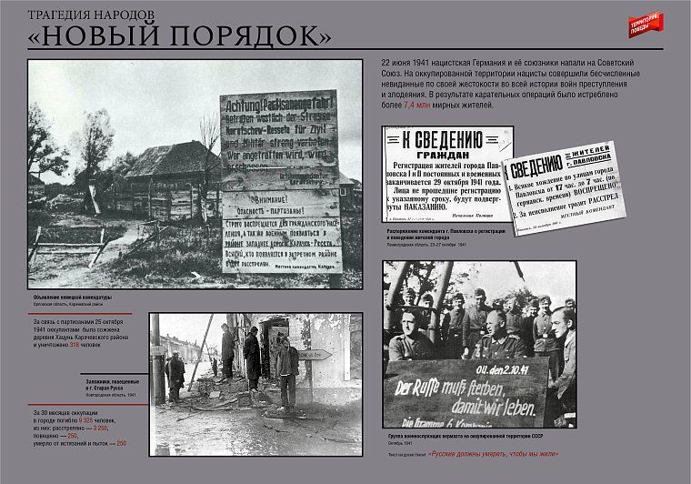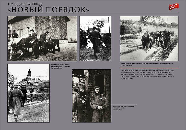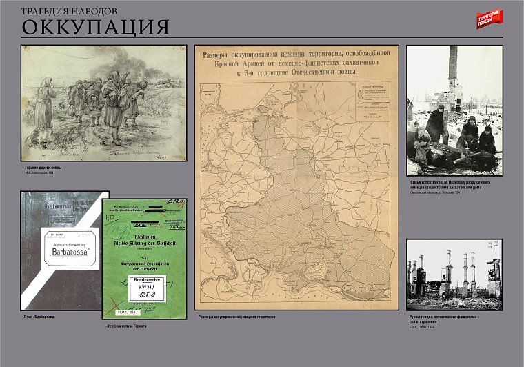 Выставка, представленная в музее на Поклонной горе под названием «Трагедия народов», посвящена памяти советских граждан, которые пострадали от нацистской агрессии и политики оккупации. Она посвящена тем, кто был замучен в гетто и концлагерях, а также угнан на принудительные работы в Германию и соседние страны. В экспозиции представлено свыше 100 оцифрованных уникальных печатных материалов из коллекции Музея Победы. Среди экспонатов — репортажные фотографии военных корреспондентов, документы, плакаты, листовки, фронтовые рисунки и произведения послевоенных художников, которые отражают преступления нацистов.