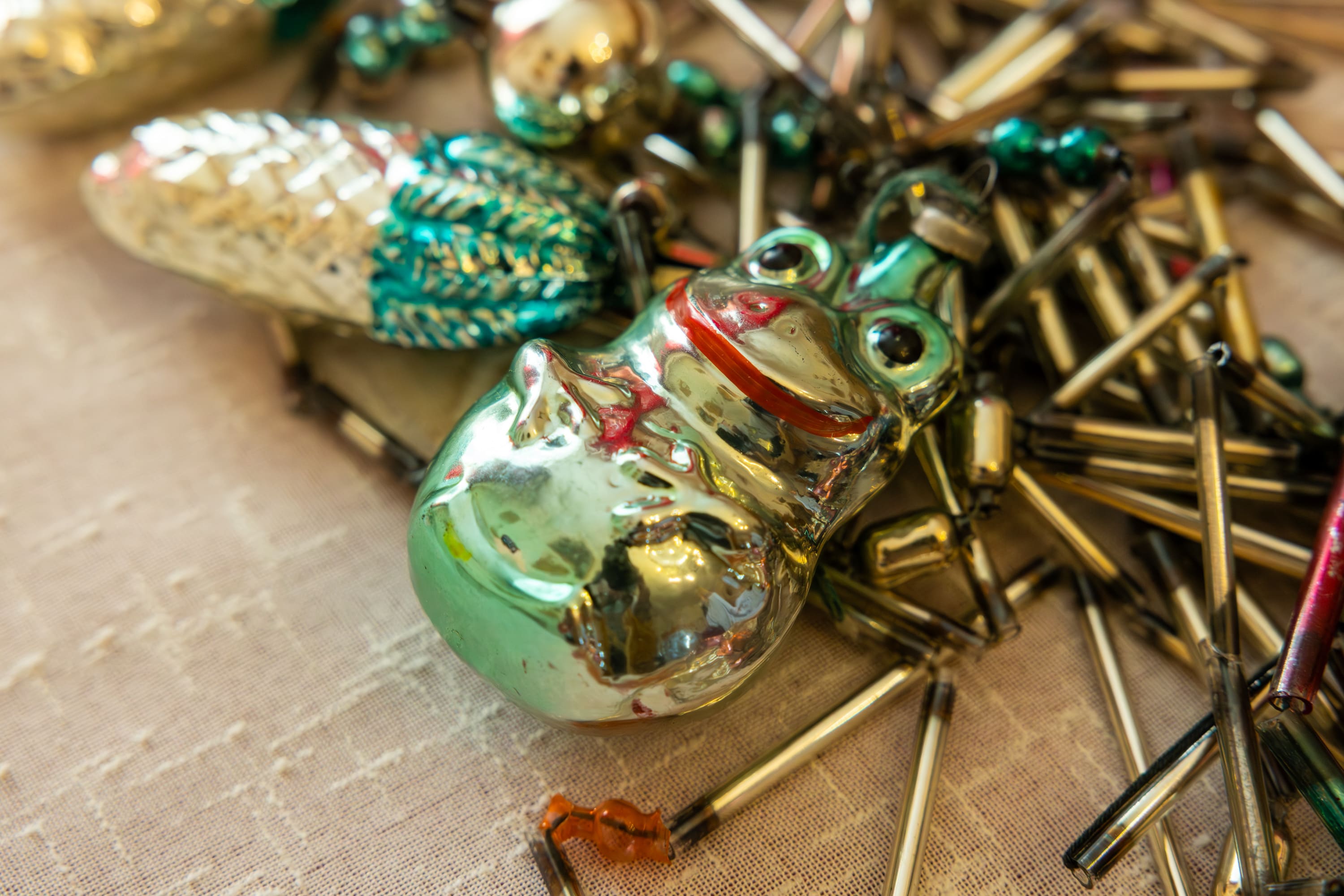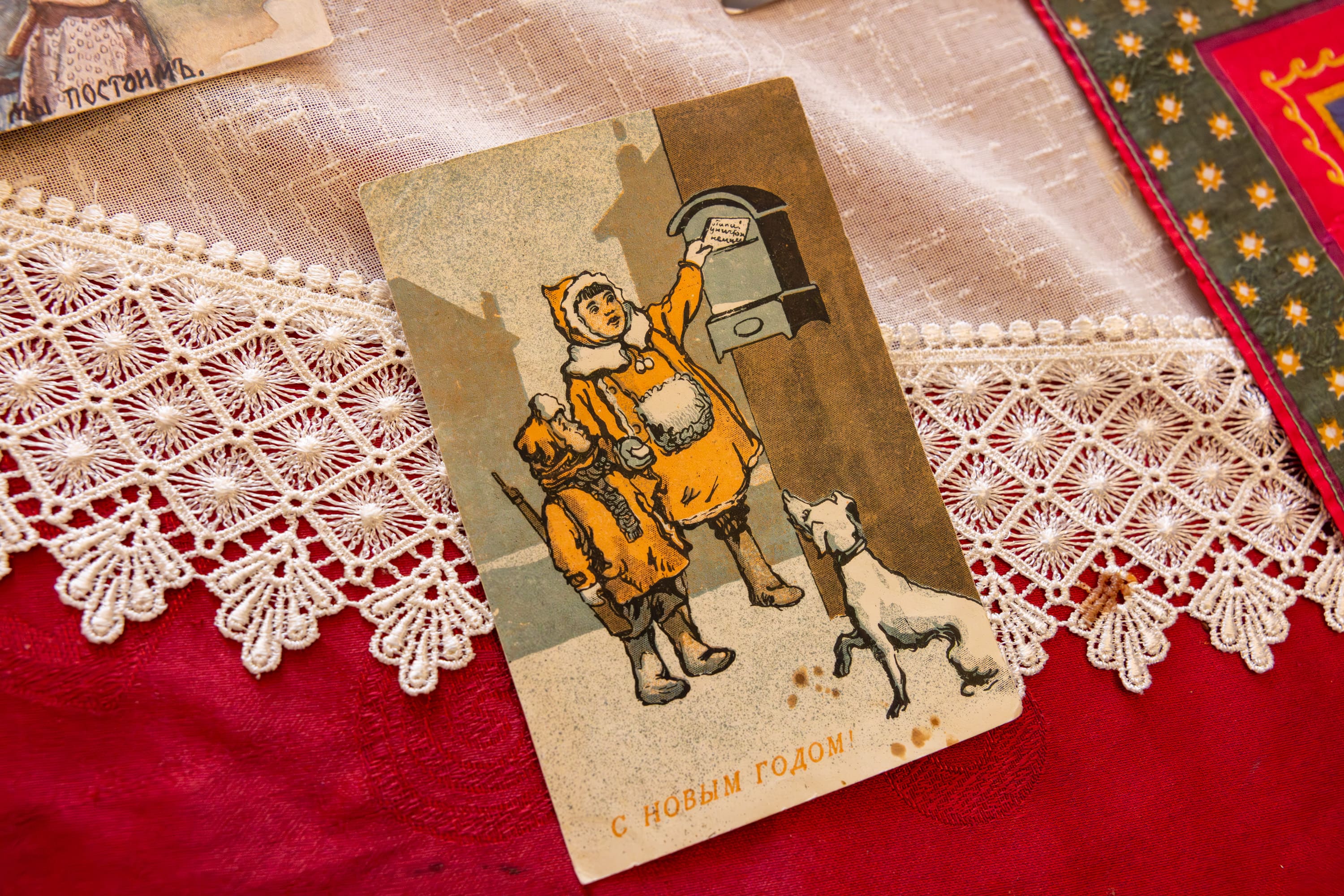Ольга Краева передала в Музей Победы дорогие сердцу елочные игрушки и редкую новогоднюю открытку военных лет. Открытка, сделанная из газетной бумаги, изображает детей, опускающих в почтовый ящик письмо солдатам.