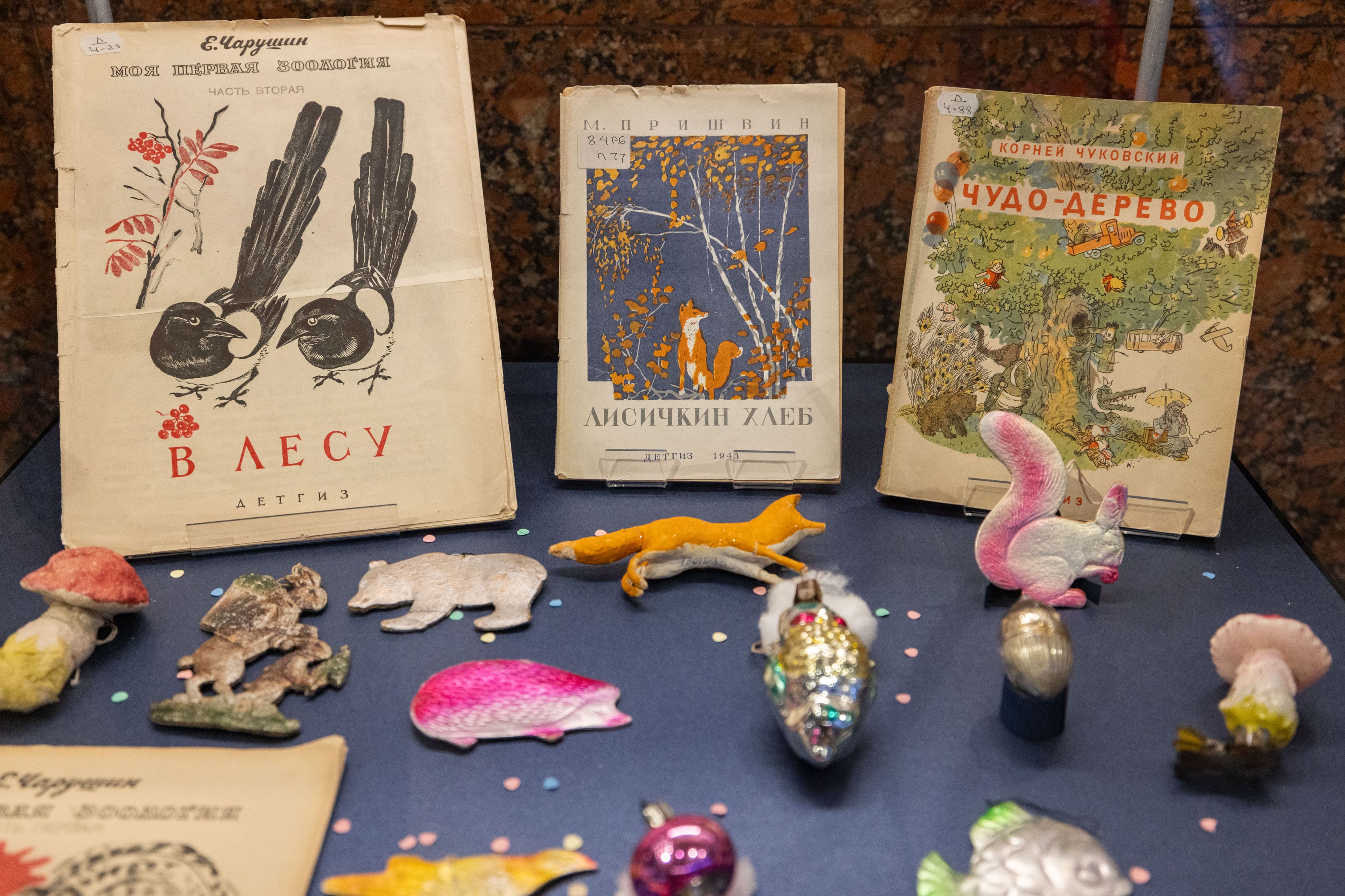 Кроме того, в выставку вошли книги, которые были неизменными спутниками детей даже в тяжелые военные годы. В витринах представлены оригинальные издания 1942-1944 годов из фонда редких книг РГДБ. Среди наиболее интересных экспонатов — сборник стихов и рассказов 1943 года «Новый год», в который вошла прозаическая версия сказки-пьесы Маршака «Двенадцать месяцев», сказки «Мороз Иванович» и «Лисичкин хлеб», книжка-малышка «Лошадка», книги о природе Евгения Чарушина «на нашем дворе» и «В лесу» с авторскими иллюстрациями и многое другое.