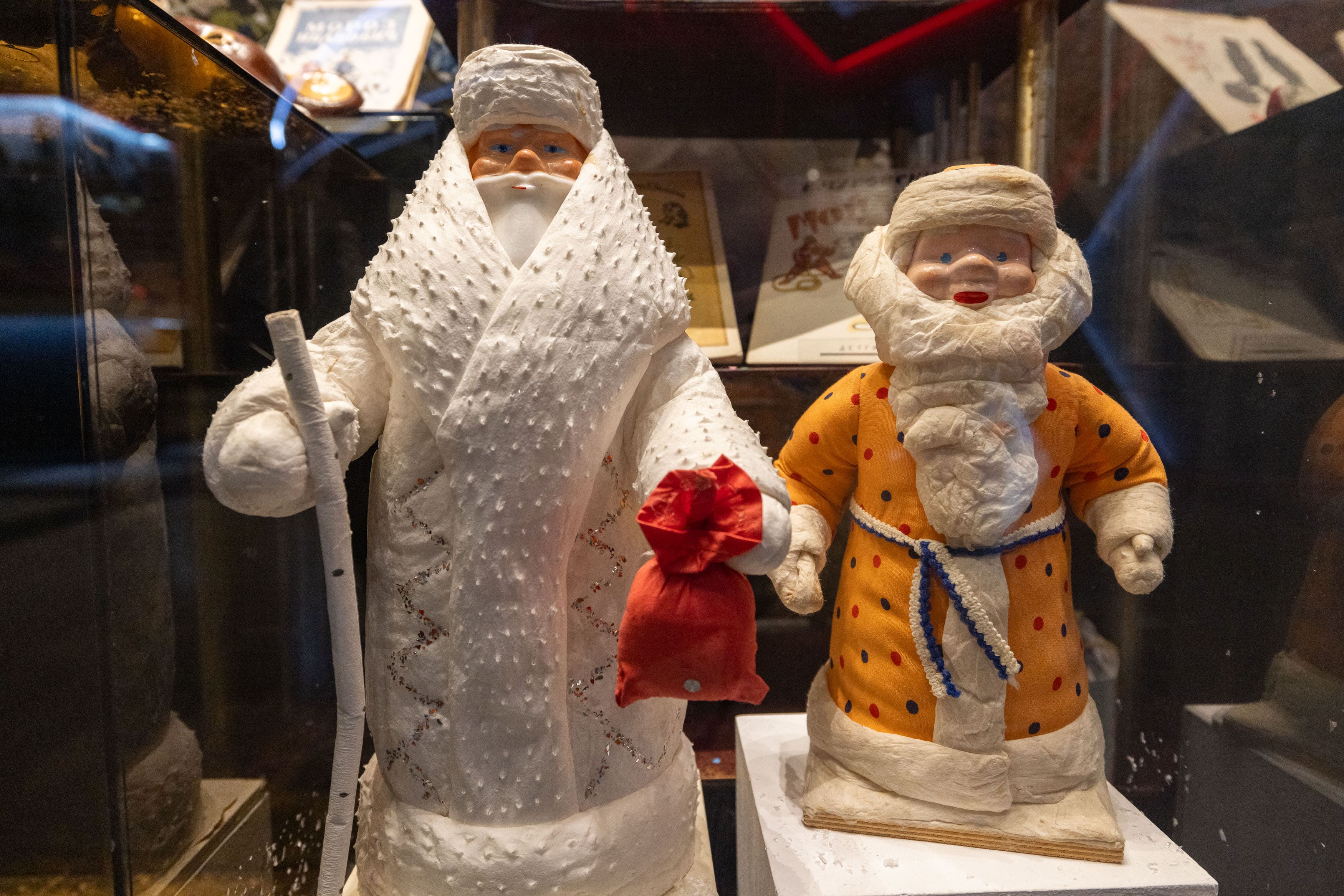 Центральное место заняла витрина, в которой можно увидеть ватные фигуры Дедов Морозов, неизменно любимые у всех детей мягкие игрушки – мишки и другие предметы быта.