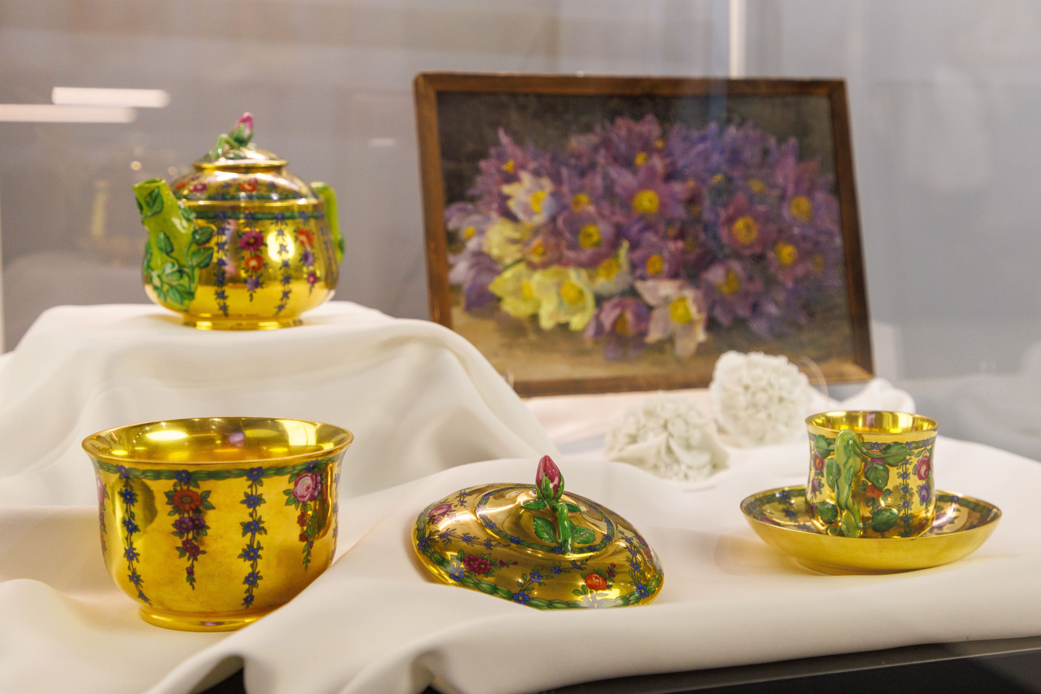 Экспозиция также включает произведения из коллекций Императорского фарфорового завода – превосходные изделия с цветочными мотивами, фарфоровые лепные цветы и изысканный сервиз «Собственный» из серии «Царское село». Эти произведения декоративно-прикладного искусства обогащают художественный рассказ, показывая, как образы вечной природы реализуются в керамике.