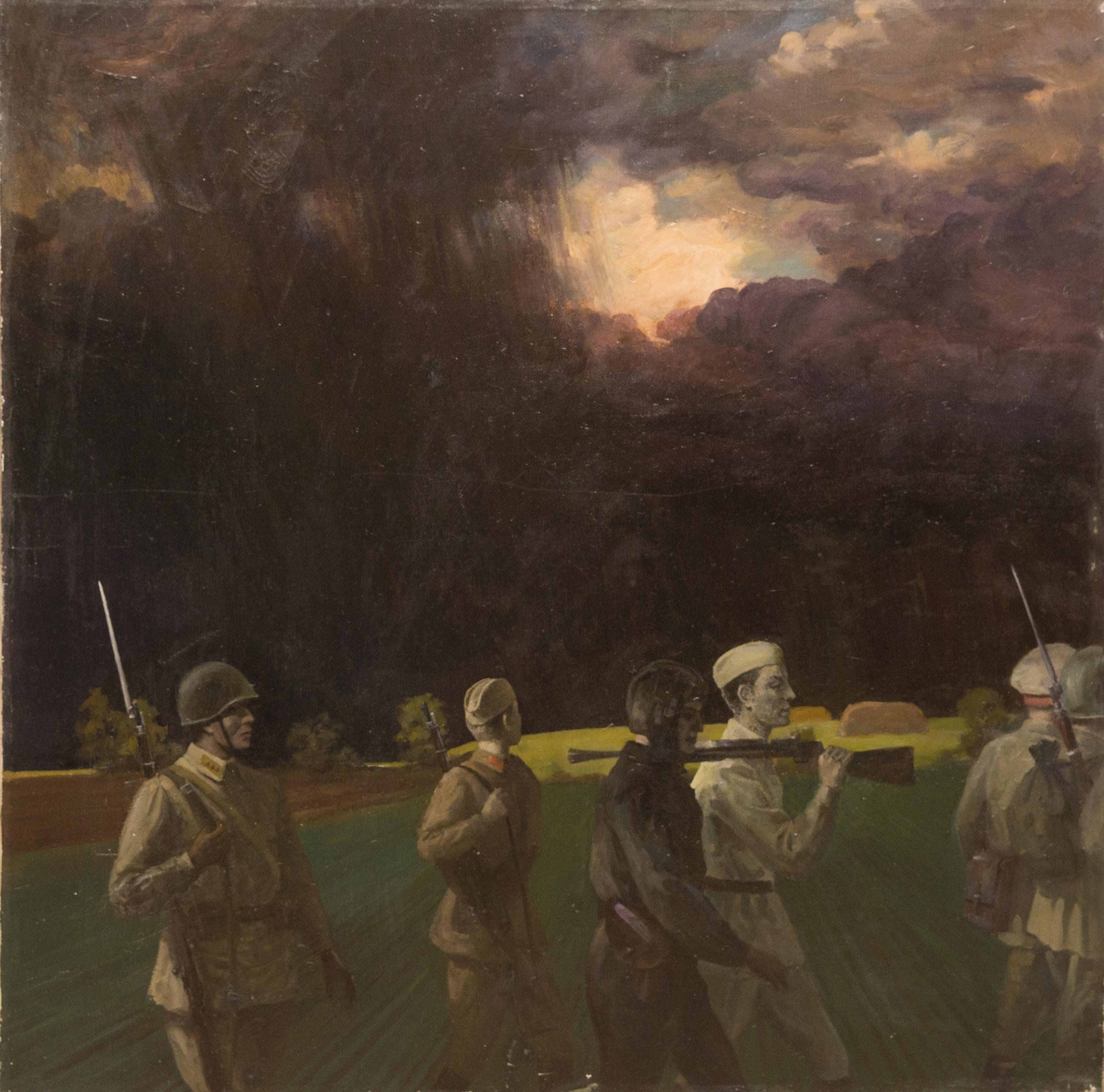 Примером является картина «Август 1941», которая передает трагические моменты начала Великой Отечественной войны. Художник решил отказаться от изображения битв, сосредоточив внимание на теме, как личные судьбы солдат сливаются с судьбой страны.