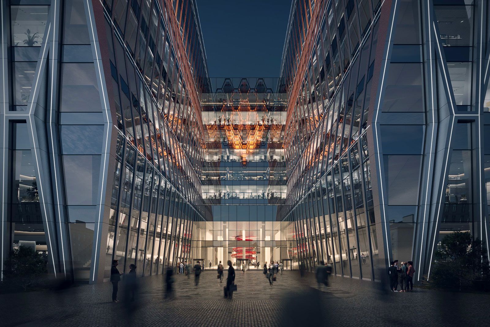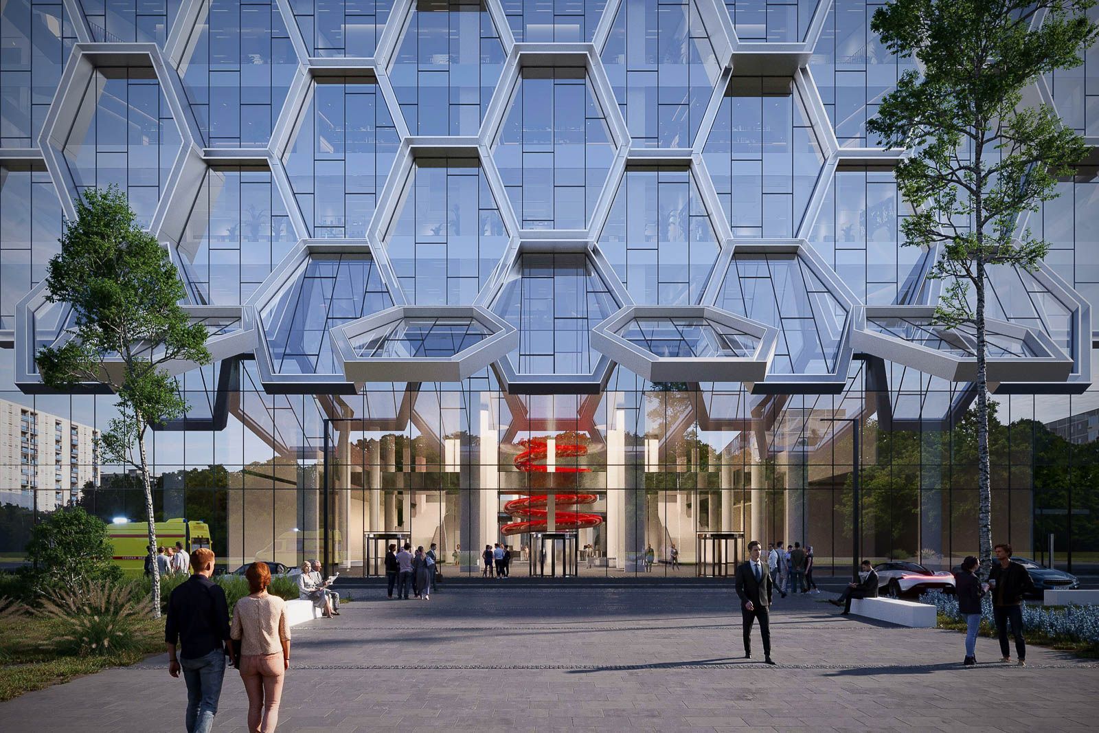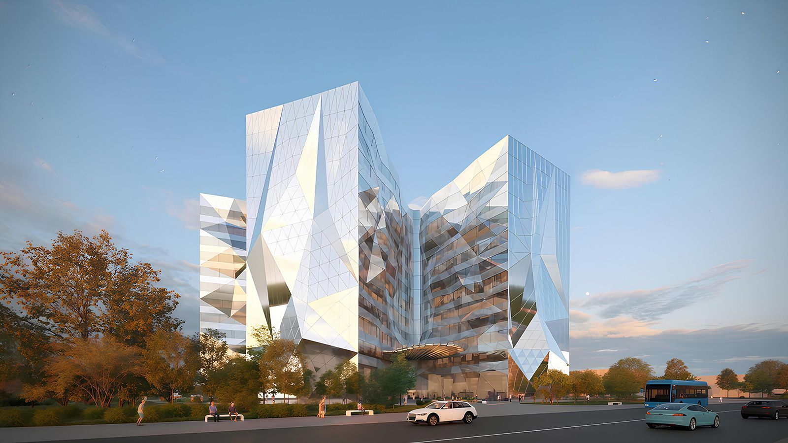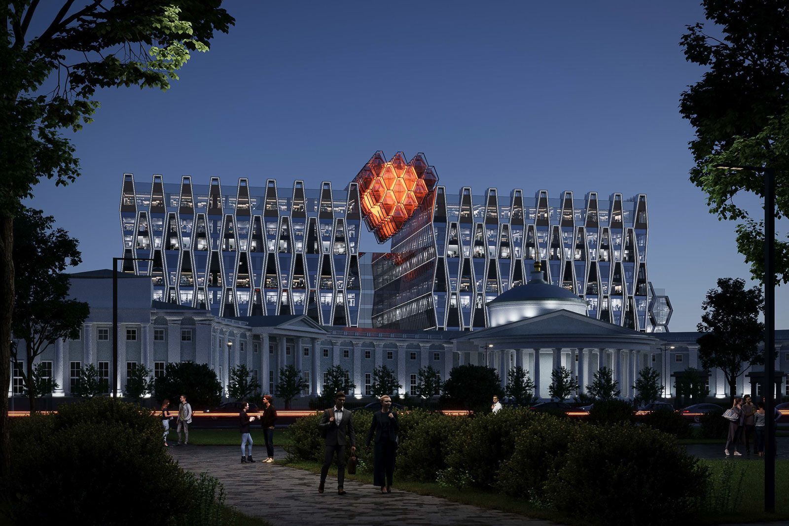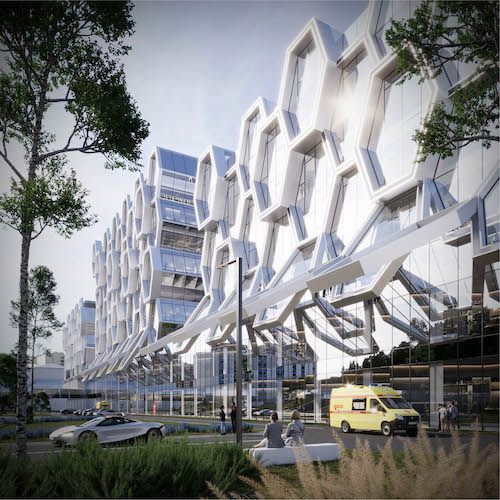 Уникальный фасад здания будет воплощён с помощью шестигранных элементов и ромбов, создавая визуальные инсталляции, такие как изображение пульсирующего сердца на фасаде, различимые издалека.