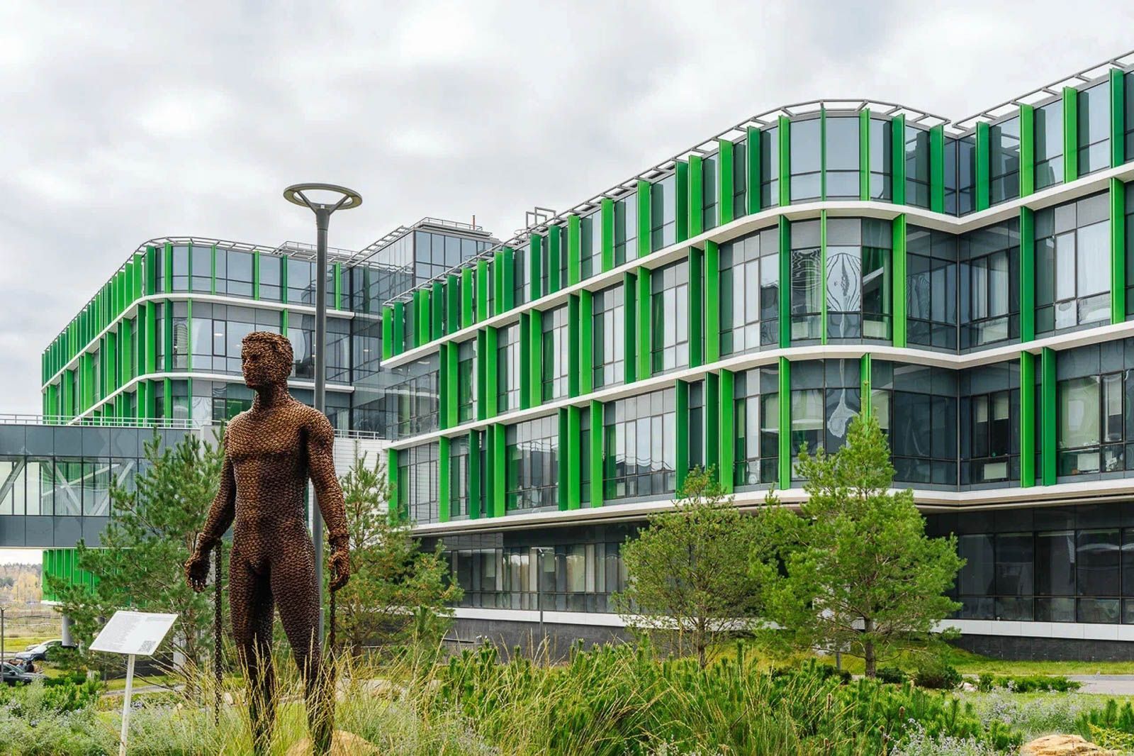 При проектировании здания использованы технологии информационного моделирования. Применение адаптивного подхода позволяет зданию приспосабливаться к новым технологиям и функциям, оставаясь актуальным на протяжении многих лет. Благодаря сложной конструкции, в большинстве помещений обеспечивается естественное освещение. Типовые этажи имеют прямоугольную форму с открытыми внутренними дворами между блоками, а фасады выполнены из светлого натурального камня.