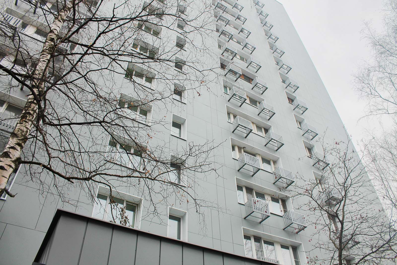 Фасад покрыли фиброцементными панелями. Цветные блоки, изготовленные на заводе, позволили придать обновлённому зданию интересные оттенки. Дом обрел современный вид благодаря использованию цветов «транспортный серый» и «сигнальный белый». Проводился также ремонт входных групп, цоколя и отмосток. В местах общего пользования усилили окна, установили корзины для кондиционеров. На балконах обновили плиты: зачистили, зашпаклевали и окрасили бетонные экраны.