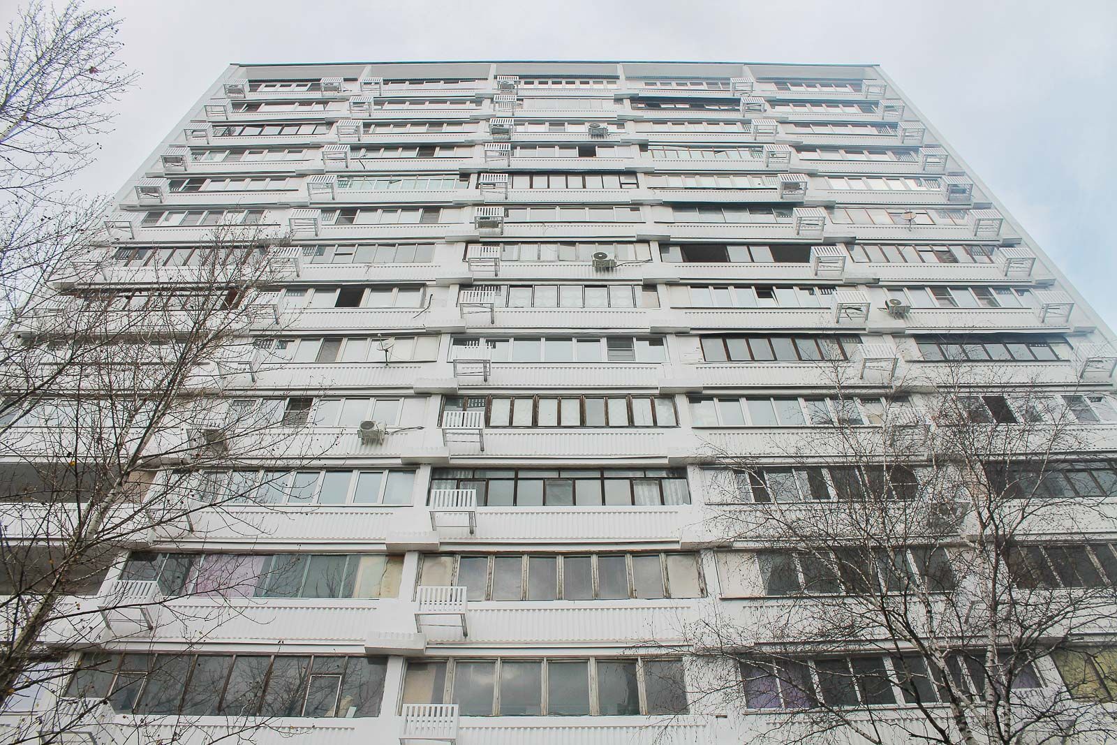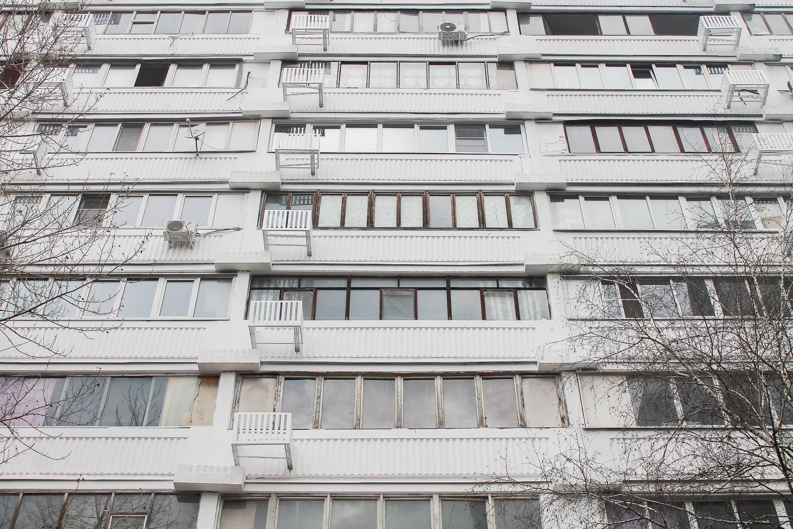 Для проведения ремонта здесь выбрали метод "мокрый фасад". После расчистки и промывки открытых плоскостей, специалисты загрунтовали поверхности и установили кронштейны для кондиционеров и корзины для них.